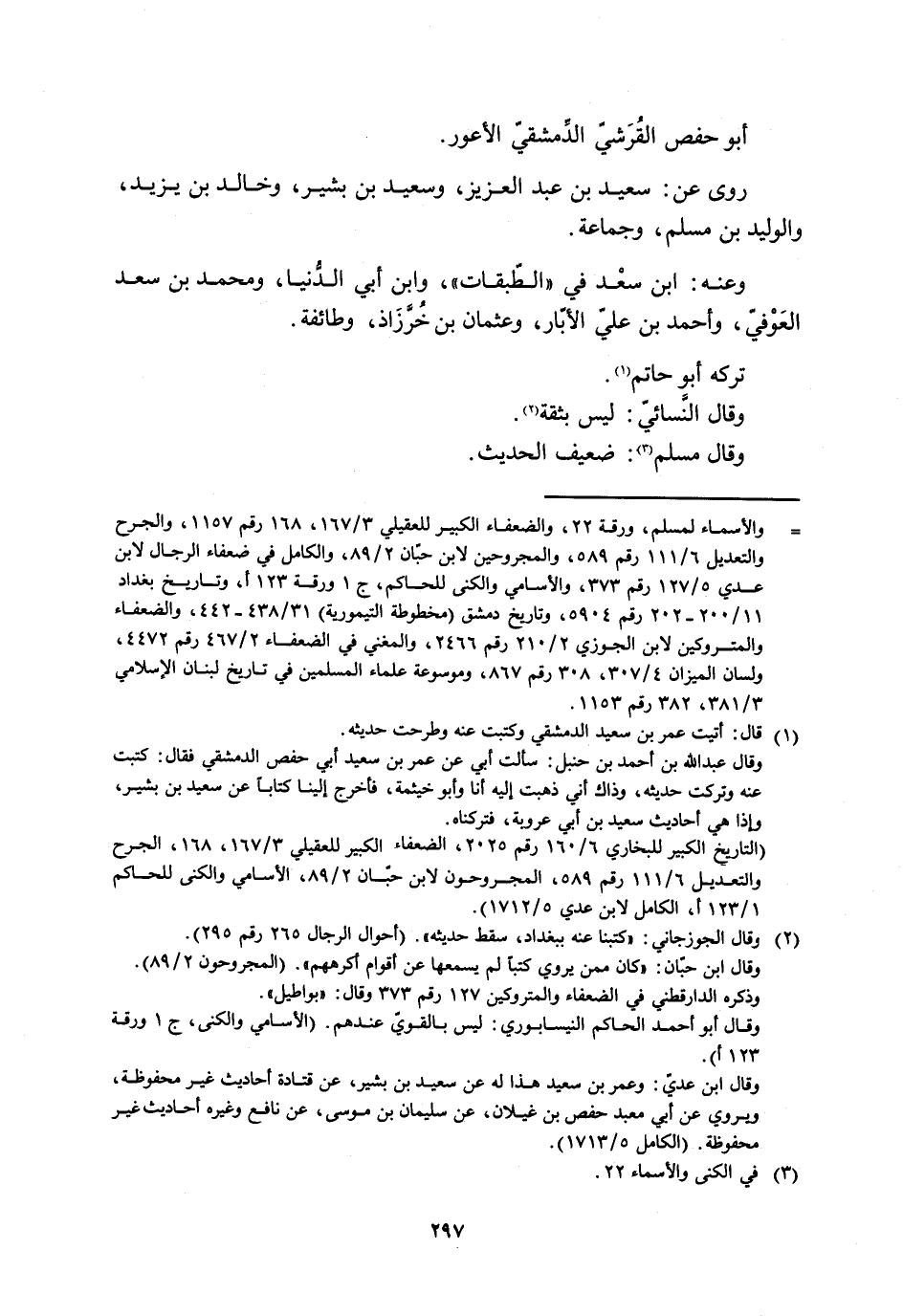 [ () ] والأسماء لمسلم، ورقة 22، والضعفاء الكبير للعقيليّ 3/ 167، 168 رقم 1157، والجرح والتعديل 6/ 111 رقم 589، والمجروحين لابن حبّان 2/ 89، والكامل في ضعفاء الرجال لابن عدي 5/ 127 رقم 373، والأسامي والكنى للحاكم، ج 1 ورقة 123 أ، وتاريخ بغداد 11/ 200- 202 رقم 5904، وتاريخ دمشق (مخطوطة التيمورية) 31/ 438- 442، والضعفاء والمتروكين لابن الجوزي 2/ 210 رقم 2466، والمغني في الضعفاء 2/ 467 رقم 4472، ولسان الميزان 4/ 307، 308 رقم 867، وموسوعة علماء المسلمين في تاريخ لبنان الإسلامي 3/ 381، 382 رقم 1153.