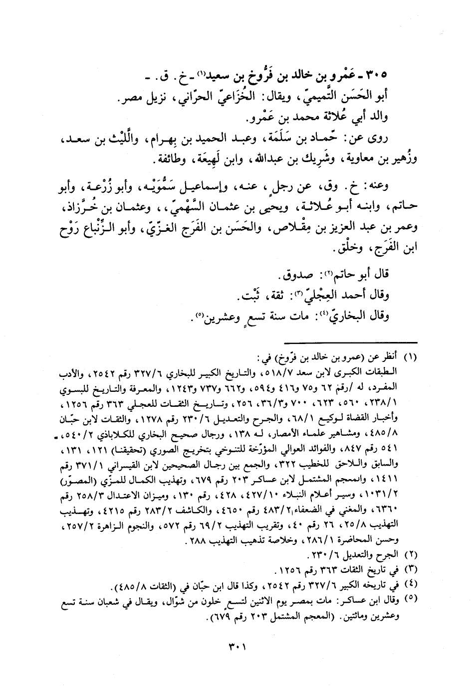 305- عَمْرو بن خالد بن فَرُّوخ بن سعيد [1]- خ. ق. - أبو الحسن التّميميّ، ويقال: الخزاعيّ الحرّاني، نزيل مصر.