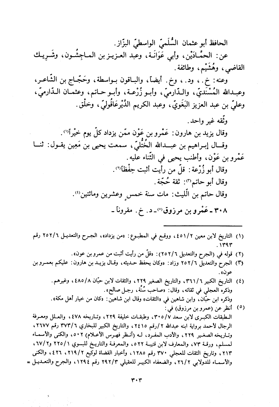 [3] الجرح والتعديل 6/ 252 وزاد: «وكان يحفظ حديثه، وقال يزيد بن هارون: عليكم بعمرو بن عون» .