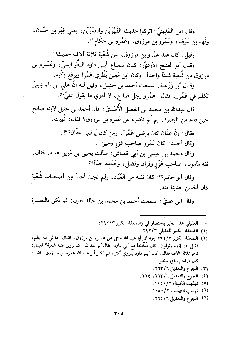 [2] الضعفاء الكبير 3/ 292 وفيه أن أبا عبد الله سئل عن عمرو بن مرزوق، فقال: ما لي به علم، فقيل له: إنهم يقولون: كان مختلفا مع أبي داود. فقال أبو عبد الله: كم روى عنه شعبة؟ فقيل: