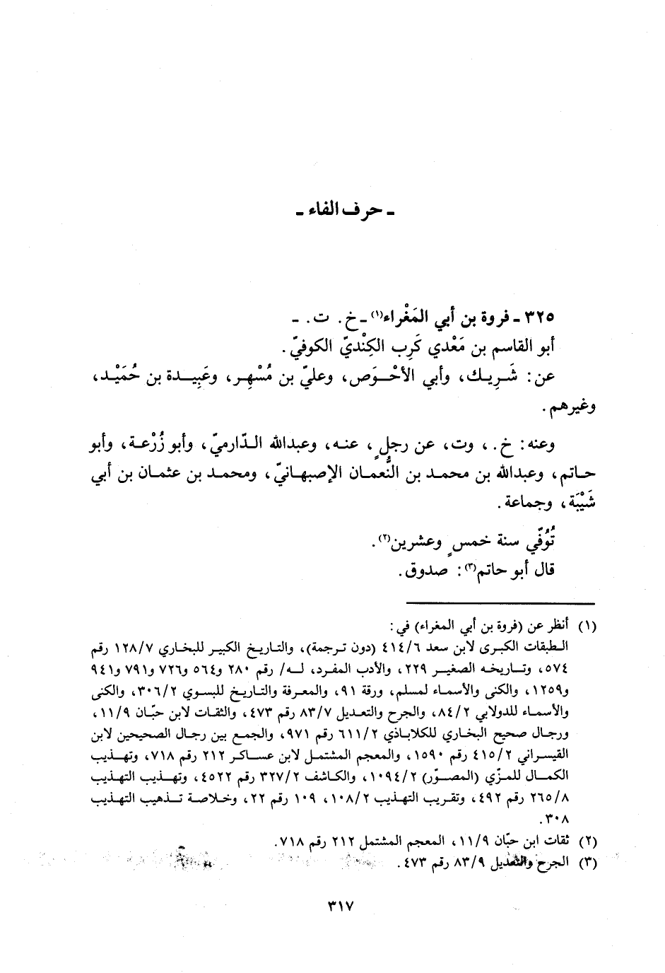 325- فروة بن أبي المغراء [1]- خ. ت. - أبو القاسم بن معديكرب الكنديّ الكوفيّ.