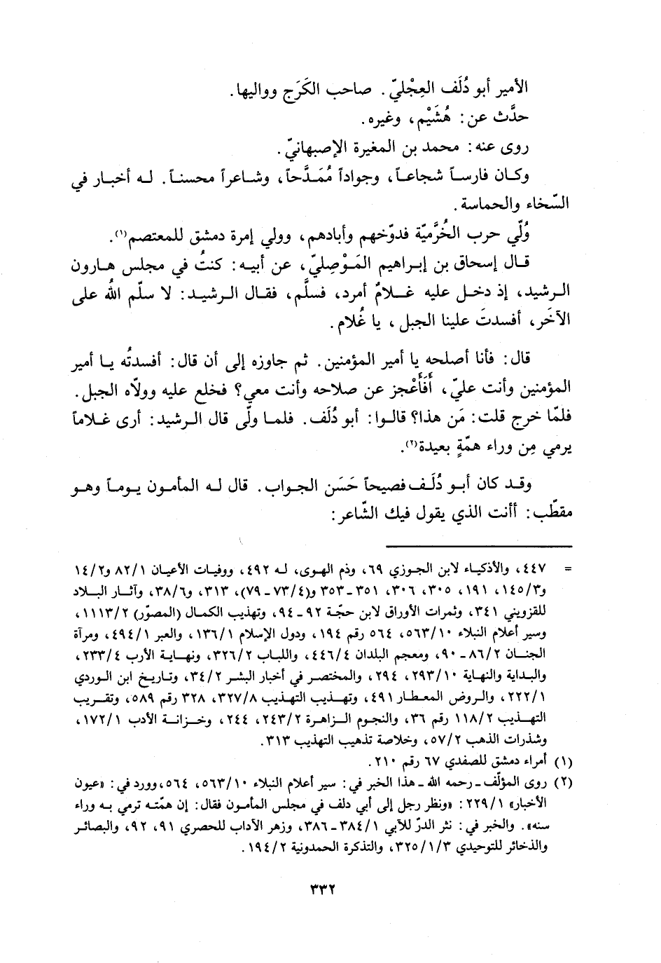 فلمّا خرج قلت: من هذا؟ قالوا: أبو دُلَف. فلمّا ولّي قال الرشيد: أرى غلامًا يرمي مِن وراء همّةٍ بعيدة [2] .