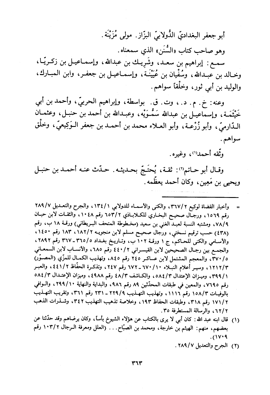 [ () ] وأخبار القضاة لوكيع 2/ 367، والكنى والأسماء للدولابي 1/ 134، والجرح والتعديل 7/ 289 رقم 1569، ورجال صحيح البخاري للكلاباذي 2/ 653 رقم 1048، والثقات لابن حبان 9/ 78، ومشتبه النسبة لعبد الغني بن سعيد (مخطوطة المتحف البريطاني) ورقة 18 ب، رقم (438) حسب ترقيم نسختي، ورجال صحيح مسلم لابن منجويه 2/ 182، 183 رقم 1450، والأسامي والكنى للحاكم، ج 1 ورقة 102 ب، وتاريخ بغداد 5/ 365- 367 رقم 2892، والجمع بين رجال الصحيحين لابن القيسراني 2/ 440 رقم 685، والأنساب لابن السمعاني 5/ 370، والمعجم المشتمل لابن عساكر 245 رقم 845، وتهذيب الكمال للمزّي (المصوّر) 3/ 1212، وسير أعلام النبلاء 10/ 670- 672 رقم 247، وتذكرة الحفّاظ 2/ 441، والعبر 1/ 399، وميزان الاعتدال 3/ 584، والكاشف 3/ 48 رقم 4988، وميزان الاعتدال 3/ 584 رقم 7695، والمعين في طبقات المحدّثين 89 رقم 986، والبداية والنهاية 10/ 299، والوافي بالوفيات 3/ 158 رقم 1116، وتهذيب التهذيب 9/ 229- 231 رقم 361، وتقريب التهذيب 2/ 171 رقم 318، وطبقات الحفاظ 193، وخلاصة تذهيب التهذيب 342، وشذرات الذهب 2/ 62، والرسالة المستطرفة 35.