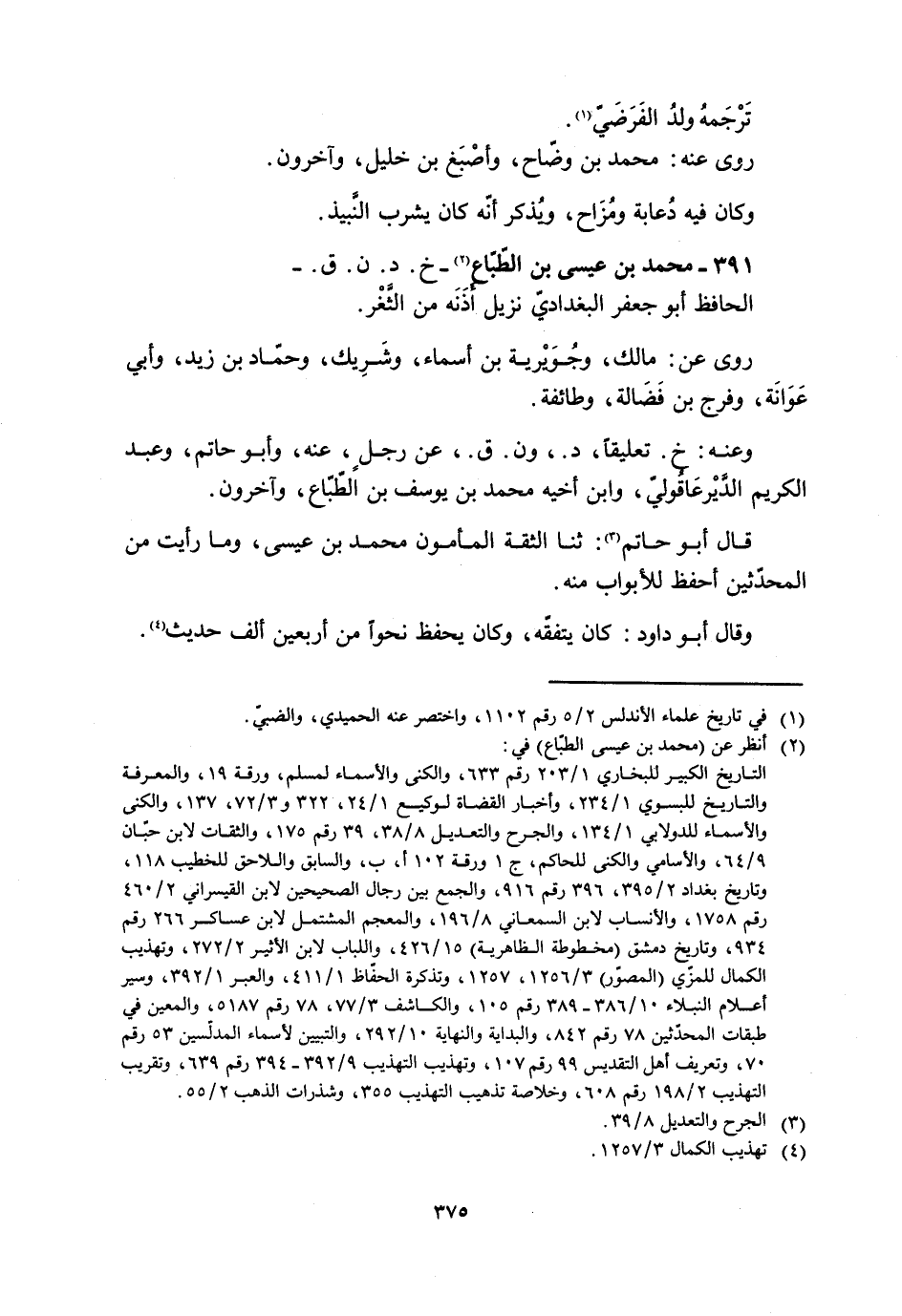 391- محمد بن عيسى بن الطّبّاع [2]- خ. د. ن. ق. - الحافظ أبو جعفر البغداديّ نزيل أَذَنَه من الثَّغْر.