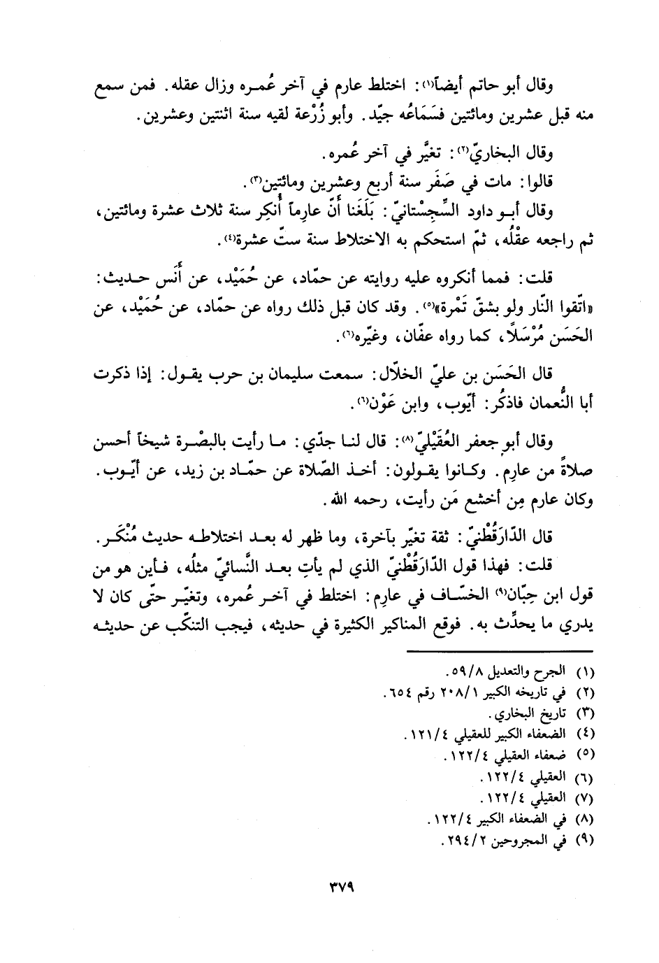قلت: فهذا قول الدَّارَقُطْنيّ الذي لم يأتِ بعد النَّسائيّ مثله، فأين هو من قول ابن حِبّان [9] الخسّاف في عارِم: اختلط في آخر عُمره، وتغيّر حتّى كان لا يدري ما يحدِّث به. فوقع المناكير الكثيرة في حديثه، فيجب التنكّب عن حديثه