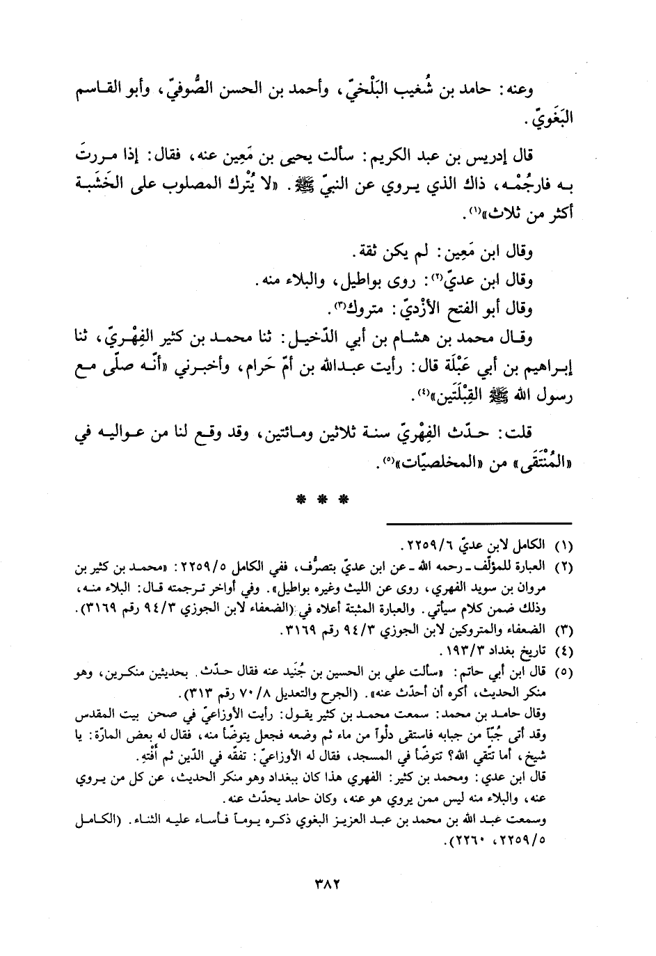 قال ابن عدي: ومحمد بن كثير: الفهري هذا كان ببغداد وهو منكر الحديث، عن كلّ مَن يروي عَنْهُ، والبلاء منه ليس ممن يروي هو عنه، وكان حامد يحدّث عنه.