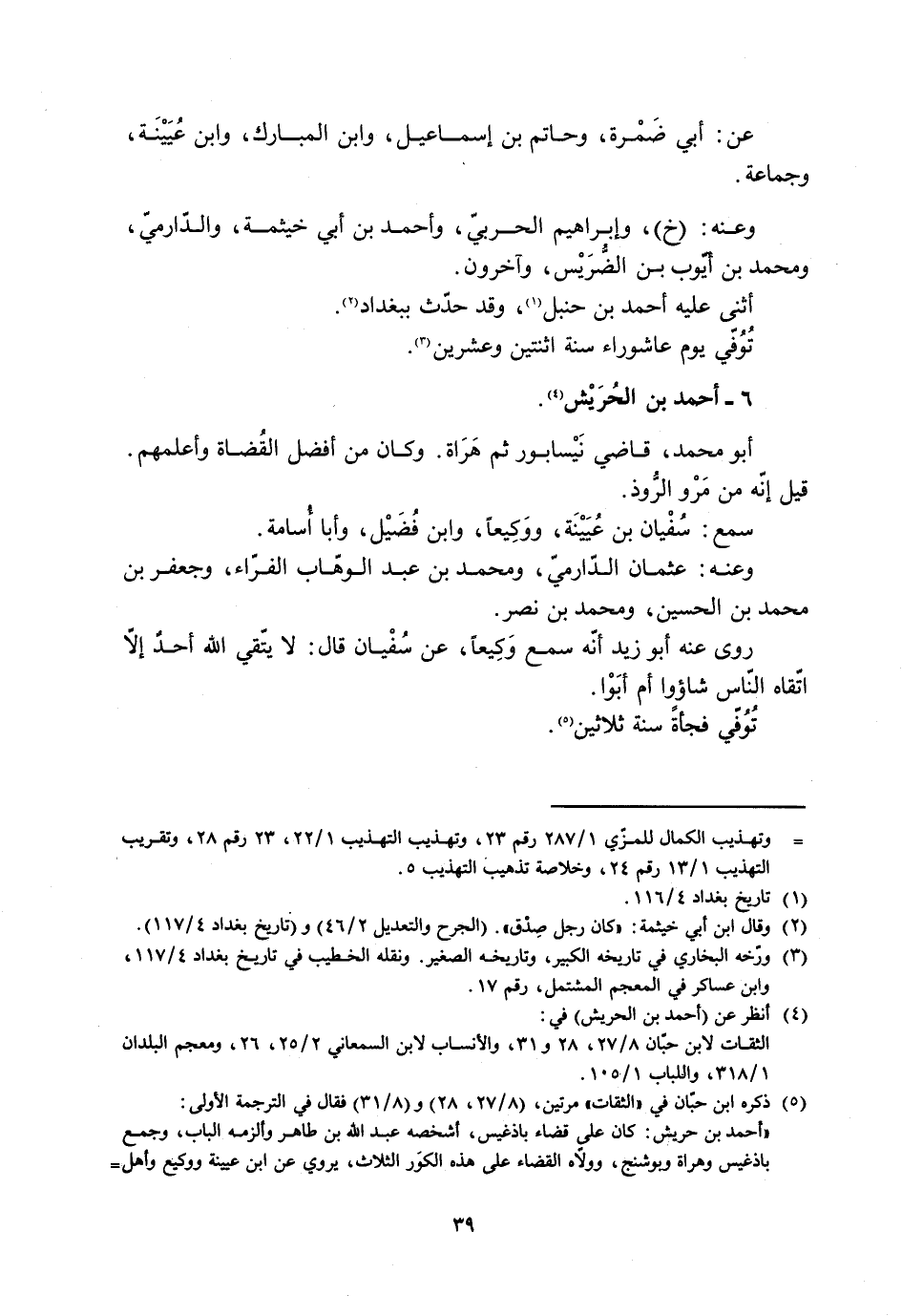 «أحمد بن حريش: كان على قضاء باذغيس، أشخصه عبد الله بن طاهر وألزمه الباب، وجمع باذغيس وهراة وبوشنج، وولّاه القضاء على هذه الكور الثلاث، يروي عن ابن عيينة ووكيع وأهل
