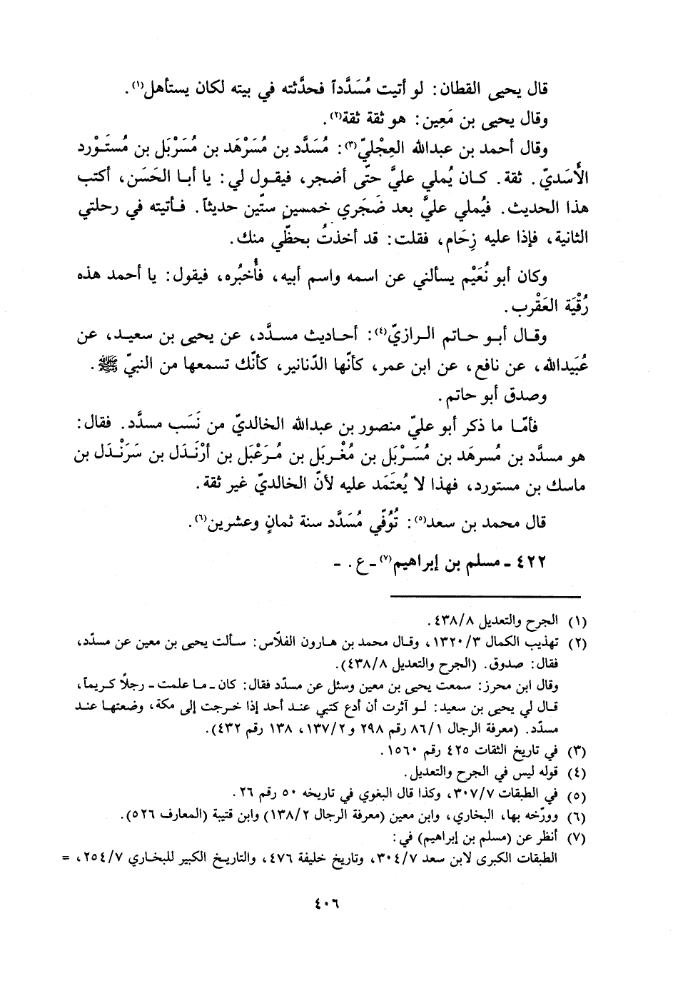 [2] تهذيب الكمال 3/ 1320، وقال محمد بن هارون الفلّاس: سألت يحيى بن معين عن مسدّد، فقال: صدوق. (الجرح والتعديل 8/ 438) .