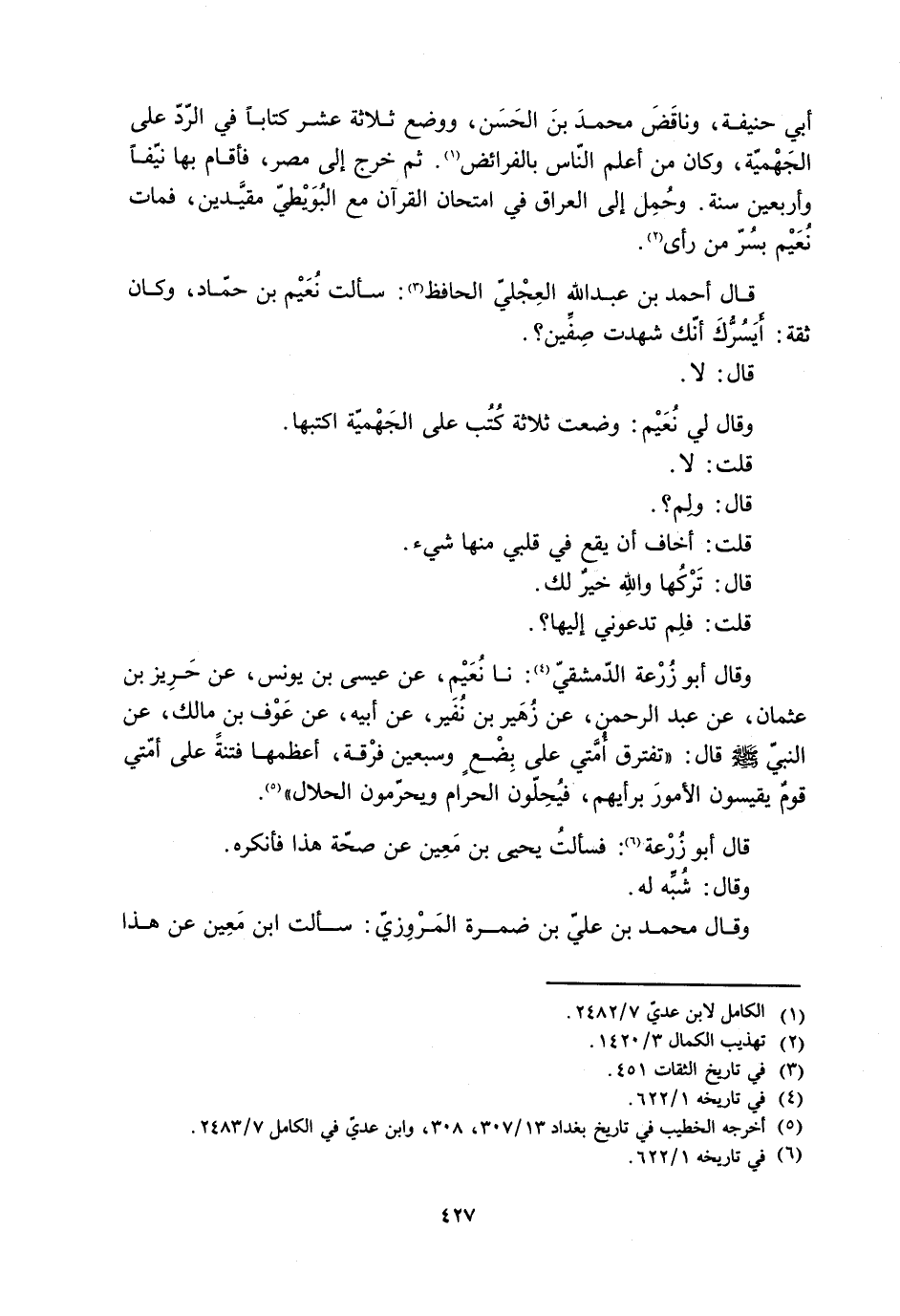 أبي حنيفة، وناقَضَ محمد بنَ الحَسَن، ووضع ثلاثة عشر كتابًا في الرّدّ على الْجَهْميّة، وكان من أعلم النّاس بالفرائض [1] . ثمّ خرج إلى مصر، فأقام بها نيّفًا وأربعين سنة. وحُمل إلى العراق في امتحان القرآن مع البُوَيْطيّ مقيدين، فمات نُعَيْم بسُرّ من رأى [2] .