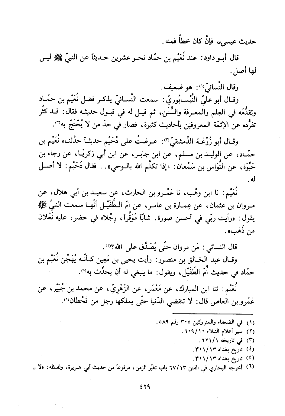 نُعَيْمٌ: نَا ابْنُ وَهْبٍ، نَا عَمْرُو بْنُ الْحَارِثِ، عَنْ سَعِيدِ بْنِ أَبِي هِلَالٍ، عَنْ مَرْوَانَ بْنِ عُثْمَانَ، عَنْ عِمَارَةَ بْنِ عَامِرٍ، عَنْ أُمِّ الطُّفَيْلِ أَنَّهَا سَمِعْتُ النَّبِيَّ صَلَّى اللَّهُ عَلَيْهِ وَسَلَّمَ يَقُولُ: «رَأَيْت رَبِّي فِي أَحْسَنِ صُورَةٍ، شَابًّا مُوَقَّرًا، رِجْلَاهُ فِي حَضْرٍ، عَلَيْهِ نَعْلَانِ مِنْ ذَهَبٍ» . قَالَ النَّسَائِيُّ: مَنْ مَرْوَانُ حَتّى يُصَدَّقَ عَلَى اللَّهِ؟ [4] .