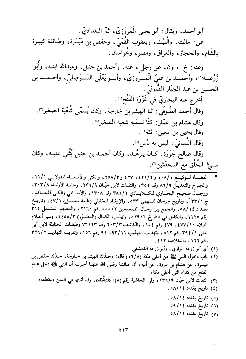 [ () ] القضاة لوكيع 1/ 108 و 2/ 421، 427 و 3/ 258، والكنى والأسماء للدولابي 1/ 11، والجرح والتعديل 9/ 86 رقم 352، والثقات لابن حبّان 9/ 236، وحلية الأولياء 8/ 303، ورجال صحيح البخاري للكلاباذي 2/ 381 رقم 1308، والأسامي والكنى للحاكم، ج 1/ 33 أ، وتاريخ جرجان للسهمي 533، والإرشاد للخليلي (طبعة ستنسل) 1/ 47، وتاريخ بغداد 14/ 58، والجمع بين رجال الصحيحين 2/ 555 رقم 2160، والمعجم المشتمل 314 رقم 1127، والكامل في التاريخ 6/ 529، وتهذيب الكمال (المصوّر) 3/ 1455، وسير أعلام النبلاء 10/ 477- 479 رقم 154، والكاشف 3/ 203 رقم 76123 وطبقات الحنابلة لابن أبي يعلى 1/ 394 رقم 512، وتهذيب التهذيب 11/ 93، 94 رقم 156، وتقريب التهذيب 2/ 326 رقم 166، والخلاصة 412.