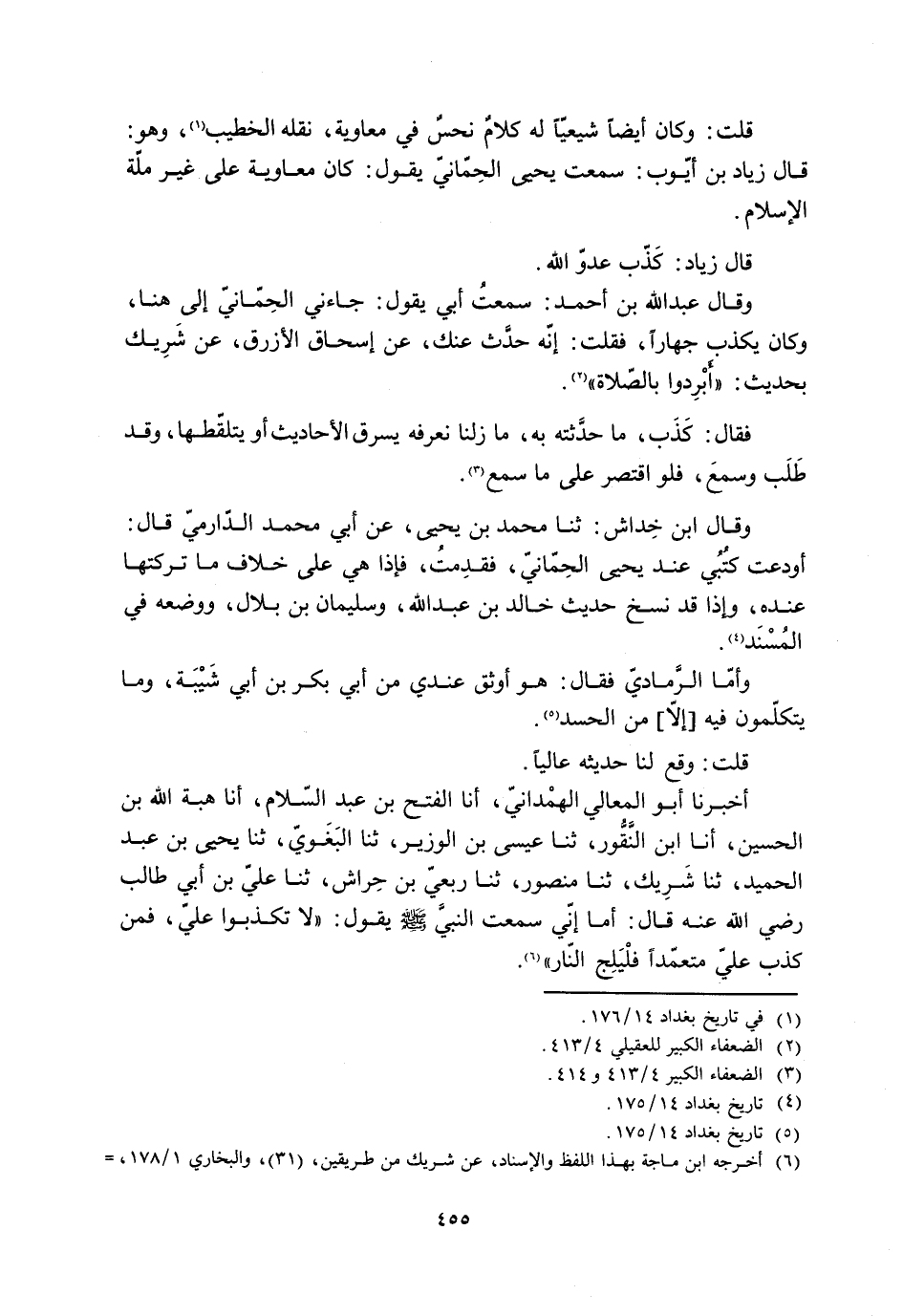 أَخْبَرَنَا أَبُو الْمَعَالِي الْهَمْدَانِيُّ، أَنَا الْفَتْحُ بْنُ عَبْدِ السَّلَامِ، أَنَا هِبَةُ اللَّهِ بْنُ الْحُسَيْنِ، أَنَا ابْنُ النَّقُّورِ، ثَنَا عِيسَى بْنُ الْوَزِيرِ، ثَنَا الْبَغَوِيُّ، ثَنَا يَحْيَى بْنُ عَبْدِ الْحَمِيدِ، ثَنَا شَرِيكٌ، ثَنَا مَنْصُورٌ، ثَنَا رِبْعِيُّ بْنُ حِرَاشٍ، ثَنَا عَلِيِّ بْن أَبِي طَالِب رَضِيَ اللَّهُ عَنْه قَالَ: أَمَا إِنِّي سَمِعْتُ النَّبِيَّ صَلَّى اللَّهُ عَلَيْهِ وَسَلَّمَ يَقُولُ: «لَا تَكْذِبُوا عَلَيَّ، فَمَنْ كَذَبَ عَلَيَّ مُتَعَمِّدًا فَلْيَلِجِ النَّارَ» [6] .