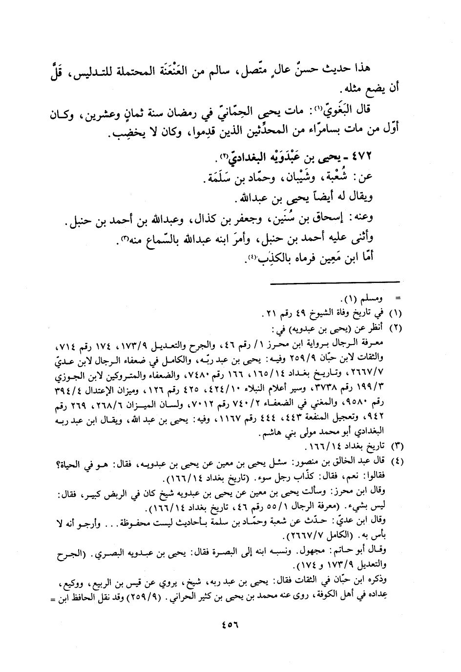 [4] قال عبد الخالق بن منصور: سئل يحيى بن معين عن يحيى بن عبدويه، فقال: هو في الحياة؟
