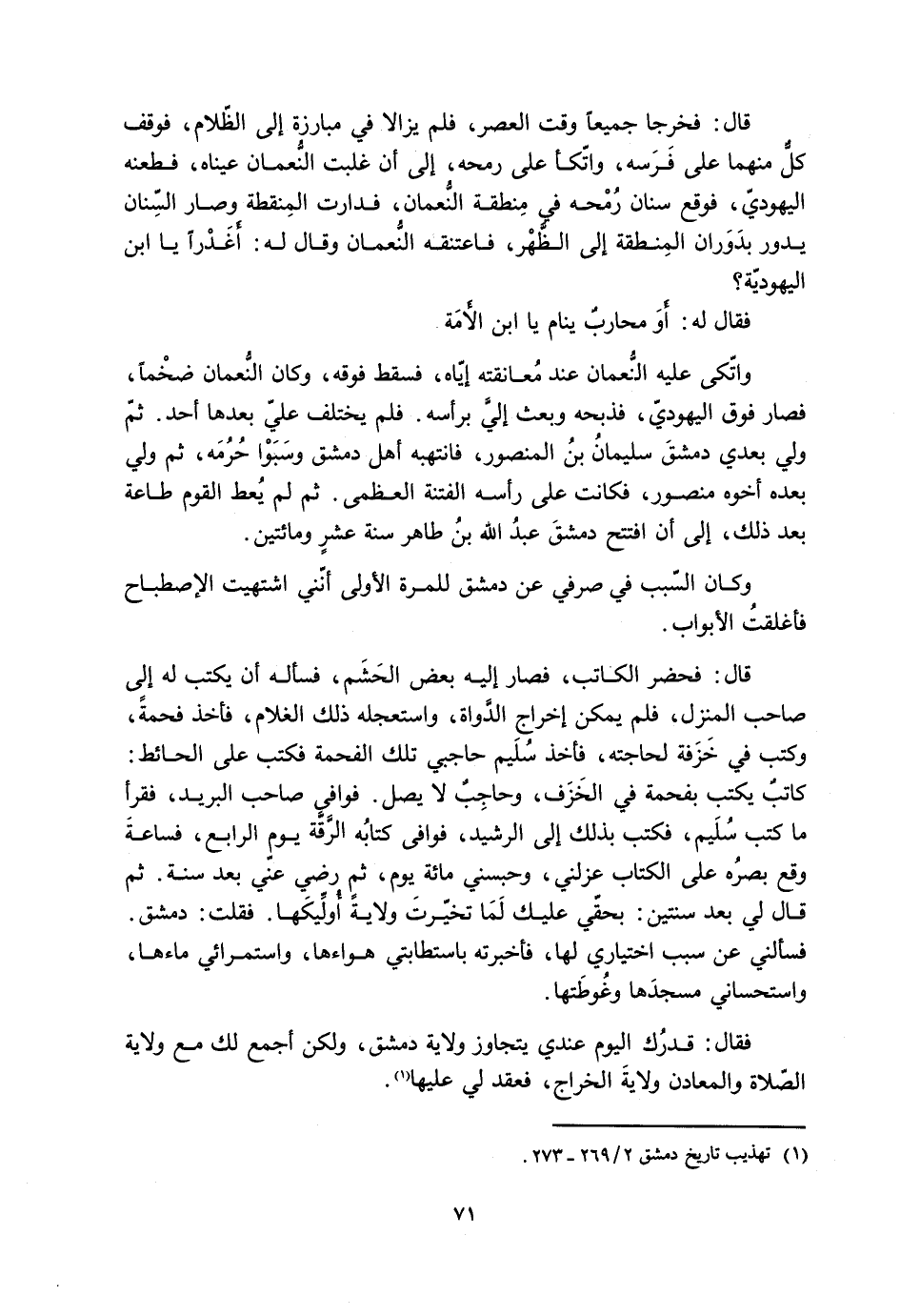 واتّكى عليه النُّعْمان عند مُعانقته إيّاه، فسقط فوقه، وكان النُّعْمان ضخْمًا، فصار فوق اليهوديّ، فذبحه وبعث إليَّ برأسه. فلم يختلف عليّ بعدها أحد. ثمّ ولي بعدي دمشقَ سليمانُ بنُ المنصور، فانتهبه أهل دمشق وسَبَوْا حُرُمَه، ثمّ ولي بعده أخوه منصور، فكانت على رأسه الفتنة العظمى. ثمّ لم يُعط القوم طاعة بعد ذلك، إلى أن افتتح دمشقَ عبدُ الله بنُ طاهر سنة عشرٍ ومائتين.