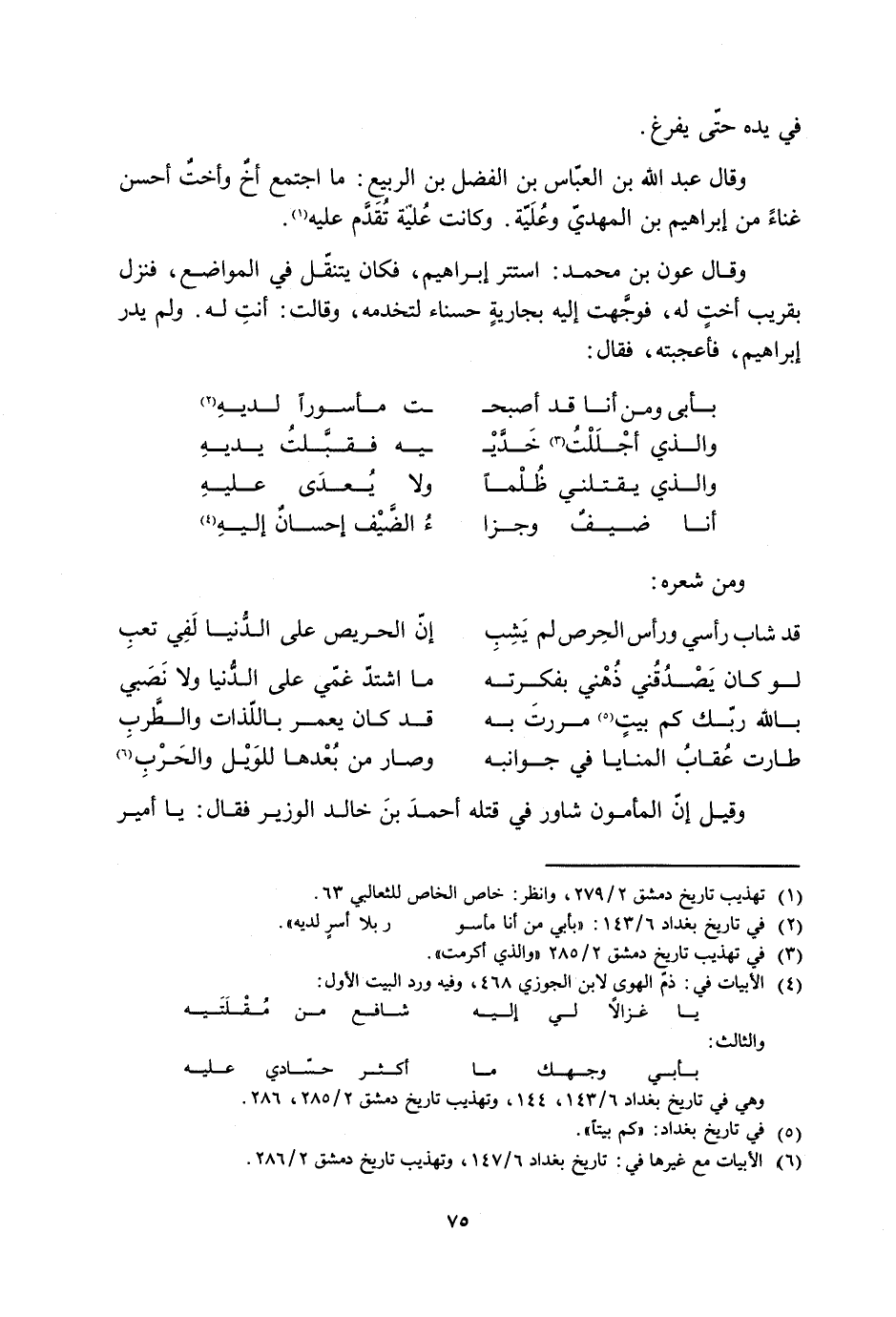 [6] الأبيات مع غيرها في: تاريخ بغداد 6/ 147، وتهذيب تاريخ دمشق 2/ 286.