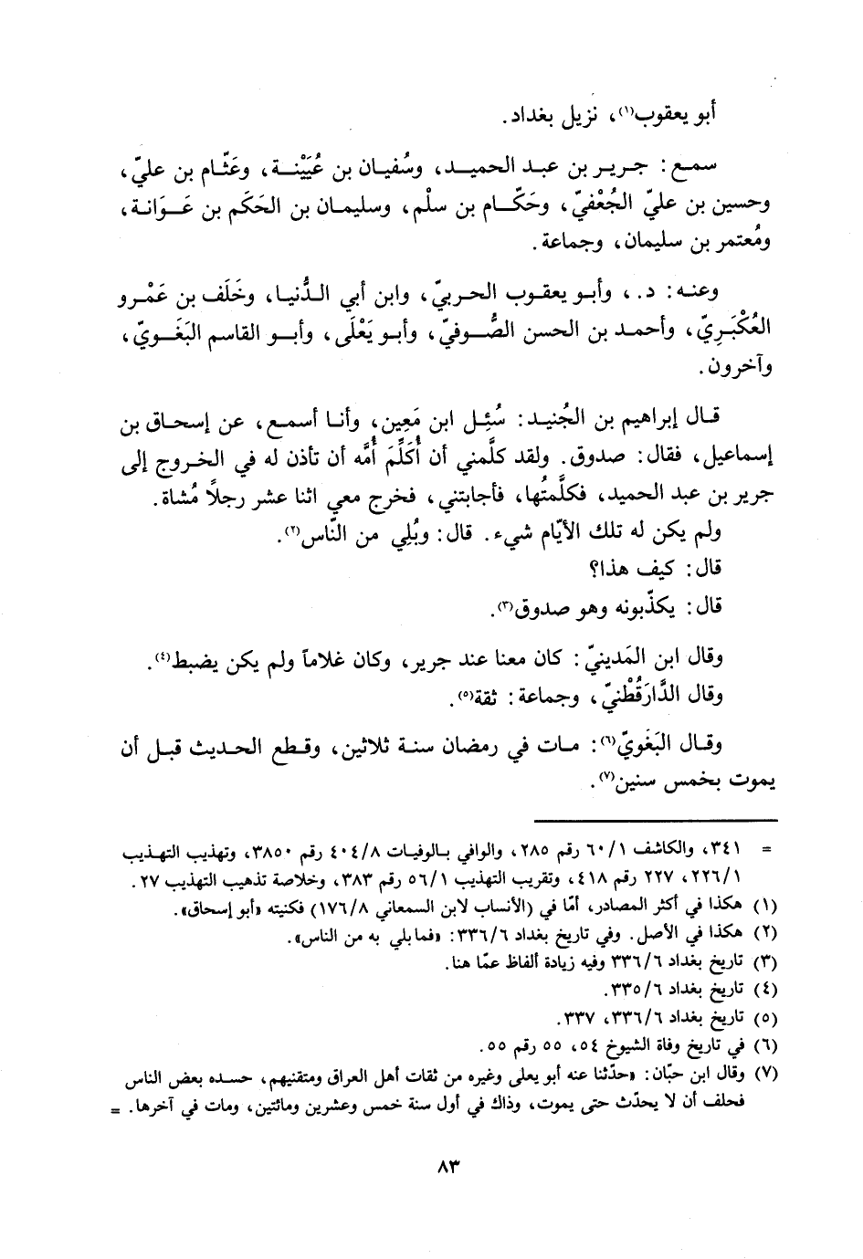 [1] هكذا في أكثر المصادر، أمّا في (الأنساب لابن السمعاني 8/ 176) فكنيته «أبو إسحاق» .