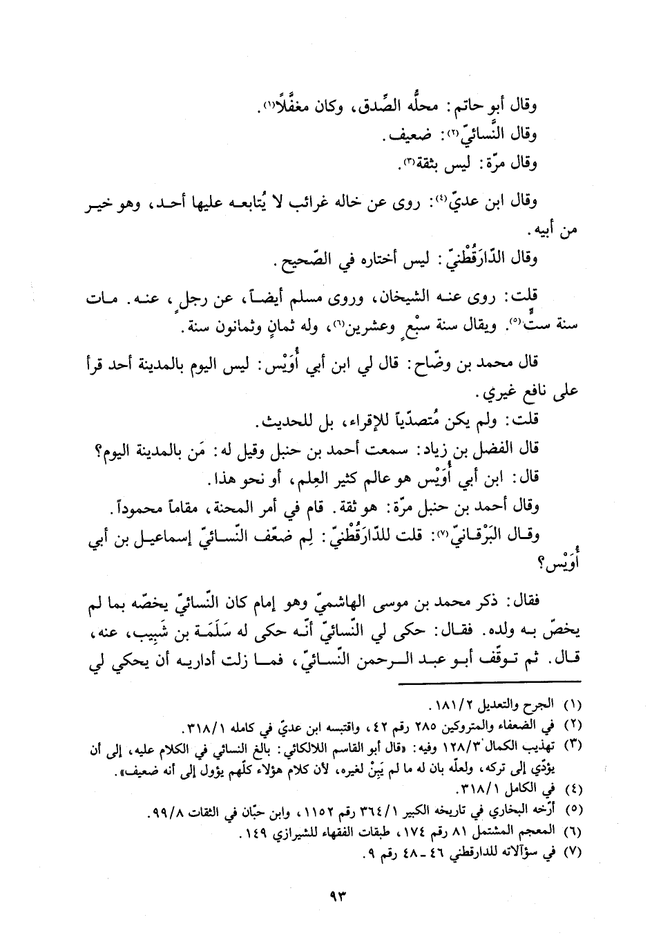 [3] تهذيب الكمال 3/ 128 وفيه: «قال أبو القاسم اللالكائي: بالغ النسائي في الكلام عليه، إلى أن يؤدّي إلى تركه، ولعلّه بان له ما لم يبن لغيره، لأن كلام هؤلاء كلّهم يؤول إلى أنه ضعيف» .