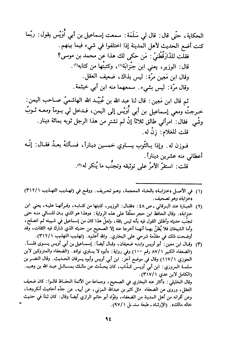 [2] العبارة عند البرقاني- ص 48: «فقال: الوزير، كتبتها من كتابه، وقرأتها عليه، يعني ابن حنزابة» . وقال الحافظ ابن حجر معلّقا على هذه الرواية: «وهذا هو الّذي بان للنسائي منه حتى تجنّب حديثه وأطلق القول فيه بأنه ليس بثقة، ولعلّ هذا كان من إسماعيل في شبيبته ثم انصلح، وأما الشيخان فلا يظنّ بهما أنهما أخرجا عنه إلا الصحيح من حديثه الّذي شارك فيه الثقات، وقد أوضحت ذلك في مقدّمة شرحي على البخاري. والله أعلم» . (تهذيب التهذيب 1/ 312) .