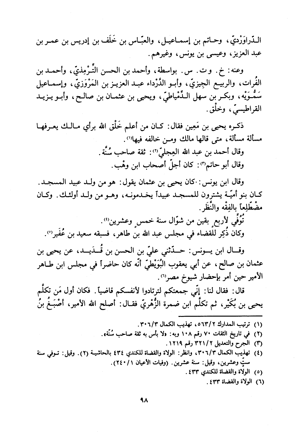 [4] تهذيب الكمال 3/ 306، وانظر: الولاة والقضاة للكندي 434 بالحاشية (2) . وقيل: توفي سنة ستّ وعشرين، وقيل: سنة عشرين. (وفيات الأعيان 1/ 240) .