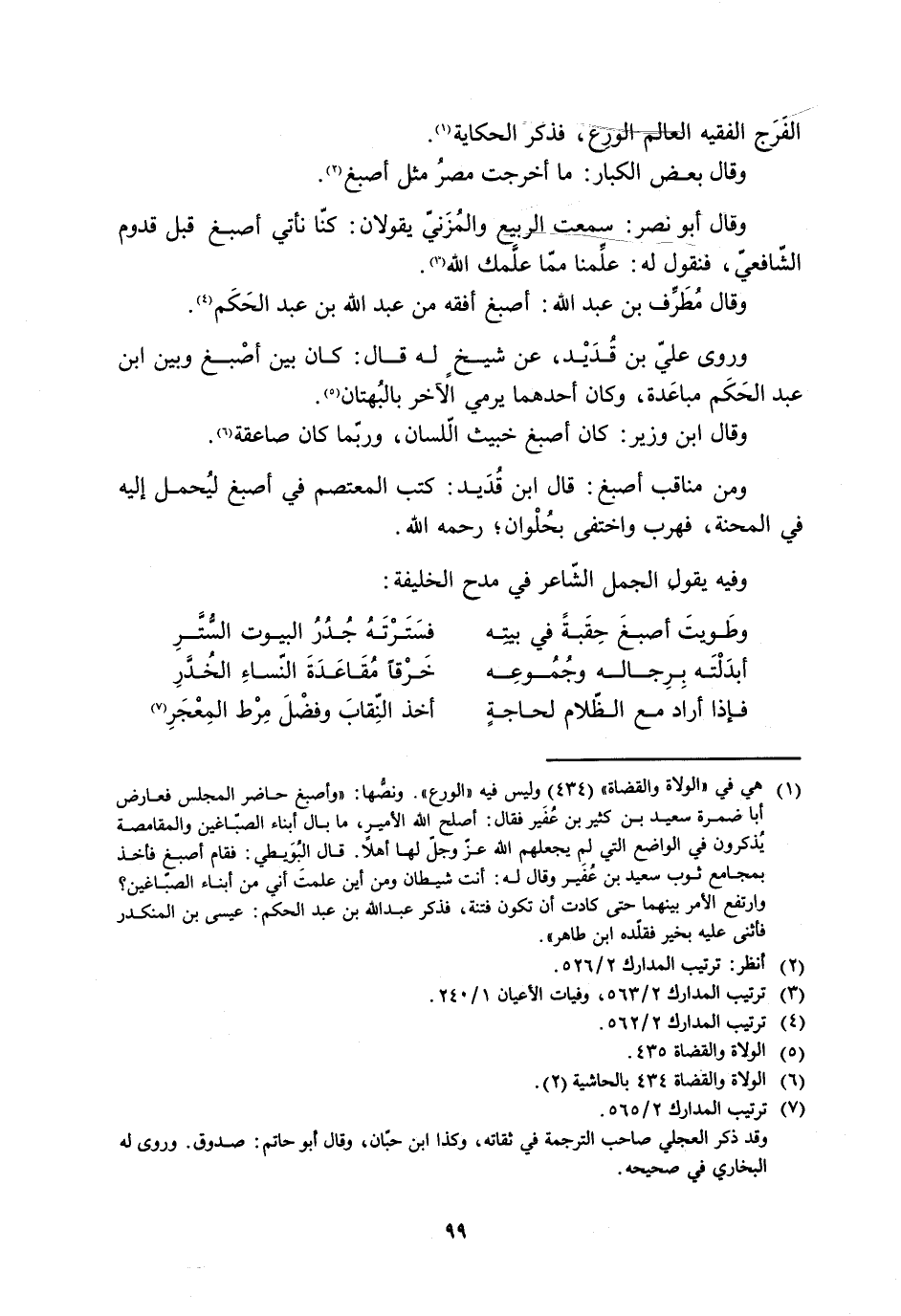 [1] هي في «الولاة والقضاة» (434) وليس فيه «الورع» . ونصّها: «وأصبغ حاضر المجلس فعارض أبا ضمرة سعيد بن كثير بن عفير فقال: أصلح الله الأمير، ما بال أبناء الصبّاغين والمقامصة يذكرون في الواضع التي لم يجعلهم الله عزّ وجلّ لها أهلا. قال البويطي: فقام أصبغ فأخذ بمجامع ثوب سعيد بن عفير وقال له: أنت شيطان ومن أين علمت أني من أبناء الصبّاغين؟