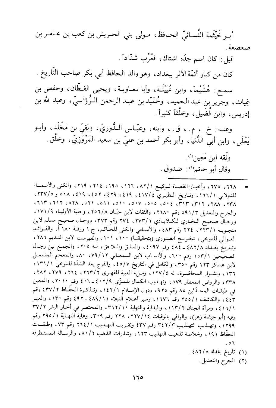 [ () ] 668، 675، وأخبار القضاة لوكيع 1/ 82، 126، 195، 214، 219، والكنى والأسماء للدولابي 1/ 166، وتاريخ الطبري 4/ 417، 419، 429، 452، 469، 508 و 5/ 237، 238، 288، 312، 313، 504، 505، 507، 510، 511، 521، 528، 612، 613، والجرح والتعديل 3/ 591 رقم 2680، والثقات لابن حبّان 8/ 256، وحلية الأولياء 9/ 171، ورجال صحيح البخاري للكلاباذي 1/ 273، 274 رقم 373، ورجال صحيح مسلم لابن منجويه 1/ 223، 224 رقم 483، والأسامي والكنى للحاكم، ج 1 ورقة 180 أ، والفوائد العوالي للتنوخي، تخريج الصوري (بتحقيقنا) 100، 101، والفهرست لابن النديم 286، وتاريخ بغداد 8/ 482- 484 رقم 4097، والسابق واللاحق، له 205، والجمع بين رجال الصحيحين 1/ 153 رقم 600، والأنساب لابن السمعاني 12/ 79، 80، والمعجم المشتمل لابن عساكر 123 رقم 350، والكامل في التاريخ 7/ 45، والفرج بعد الشدّة للتنوخي 1/ 131، 136، ونشوار المحاضرة، له 4/ 127، وملء العيبة للفهري 2/ 263، 264، 279، 282، 338، والروض المعطار 579، وتهذيب الكمال للمزّي 9/ 402- 406 رقم 2010، والمعين في طبقات المحدّثين 85 رقم 925، ودول الإسلام 1/ 142، وتذكرة الحفّاظ 2/ 437 رقم 443، والكشاف 1/ 255 رقم 1676، وسير أعلام النبلاء 11/ 489- 492 رقم 130، والعبر 1/ 416، ومرآة الجنان 2/ 113، والبداية والنهاية 10/ 312، والمختصر في أخبار البشر 2/ 37 وفيه (أبو جيثمة زهر) ، والوافي بالوفيات 14/ 227، 228 رقم 309، وغاية النهاية 1/ 295 رقم 1299، وتهذيب التهذيب 3/ 342 رقم 437 وتقريب التهذيب 1/ 264 رقم 73، وطبقات الحفّاظ 191، وخلاصة تذهيب التهذيب 123، وشذرات الذهب 2/ 80، والرسالة المستطرفة 56.