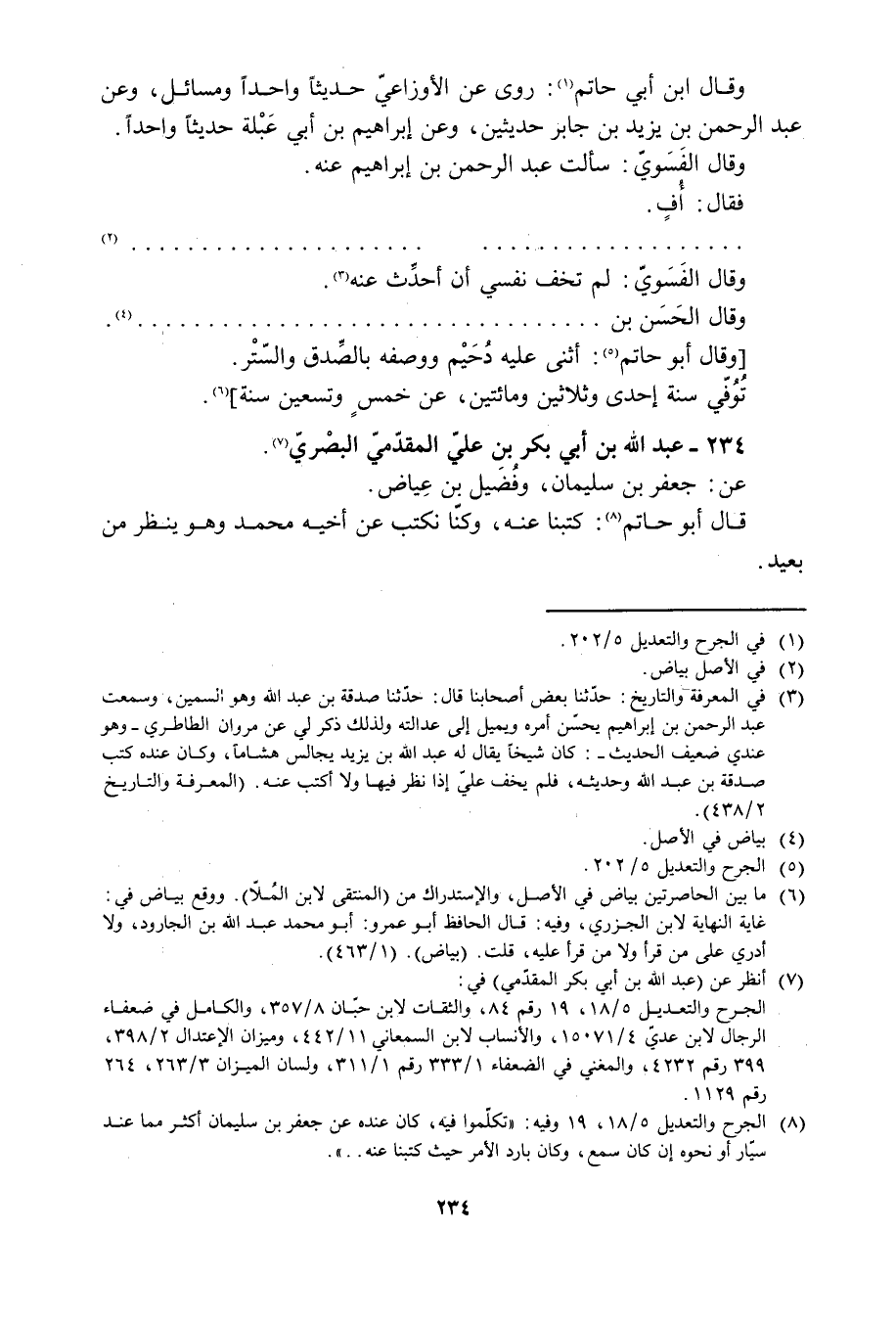 [8] الجرح والتعديل 5/ 18، 19 وفيه: «تكلّموا فيه، كان عنده عن جعفر بن سليمان أكثر مما عند سيّار أو نحوه إن كان سمع، وكان بارد الأمر حيث كتبنا عنه..» .