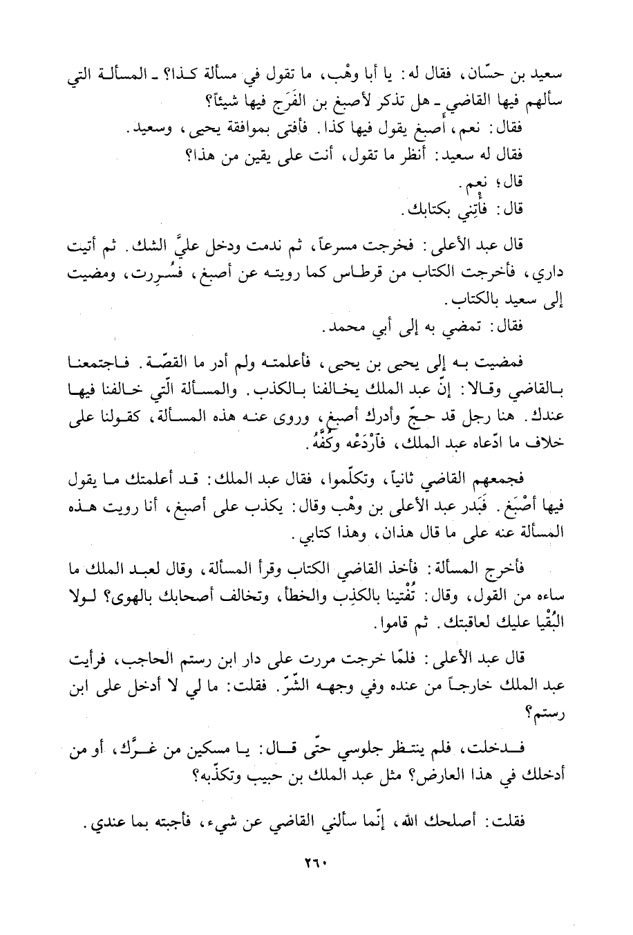 فجمَعهم القاضي ثانيًا، وتكلّموا، فقال عَبْد الملك: قد أعلمتُك ما يقولُ فيها أَصْبَغ. فبَدرَ عَبْد الأعلى بْن وَهْب وقال: يكذب عَلَى أصبغ، أَنَا رويت هذه المسألة عَنْهُ عَلَى ما قَالَ هذان، وهذا كتابي.