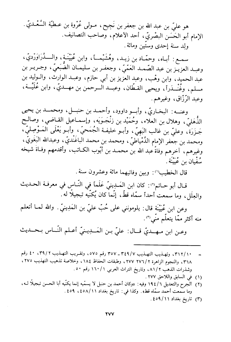 [2] الجرح والتعديل 6/ 194 وفيه: «وكان أحمد بن حنبل لا يسمّيه إنما يكنّيه أبا الحسن تبجيلا له، وما سمعت أحمد سمّاه قط» . وكذا في: تاريخ بغداد 11/ 458، 459.