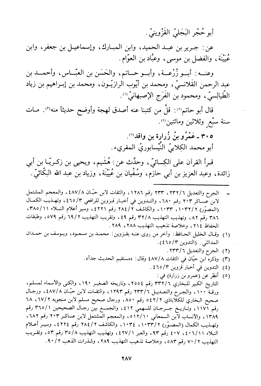 [ () ] الجرح والتعديل 6/ 232، 233 رقم 1286، والثقات لابن حبّان 8/ 487، والمعجم المشتمل لابن عساكر 203 رقم 680، والتدوين في أخبار قزوين للرافعي 3/ 465، وتهذيب الكمال (المصوّر) 2/ 1032، 1033، والكاشف 2/ 284 رقم 4221، وسير أعلام النبلاء 11/ 385، 386 رقم 82، وتهذيب التهذيب 8/ 32 رقم 49، وتقريب التهذيب 2/ 69 رقم 579، وطبقات الحفاظ 214، وخلاصة تذهيب التهذيب 288، 289.