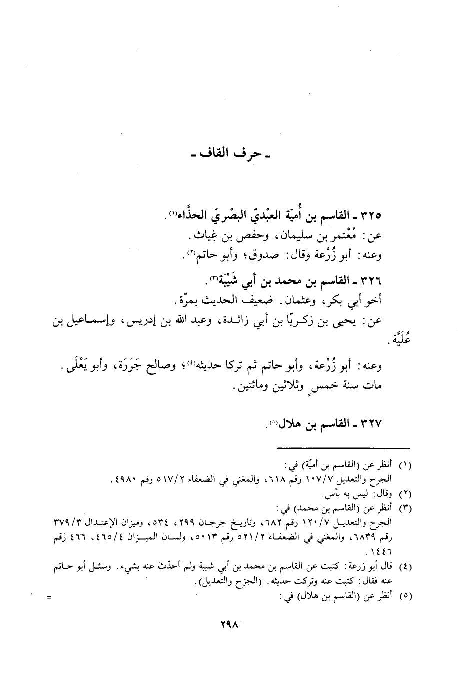 [4] قال أبو زرعة: كتبت عن القاسم بن محمد بن أبي شيبة ولم أحدّث عنه بشيء. وسئل أبو حاتم عنه فقال: كتبت عنه وتركت حديثه. (الجرح والتعديل) .