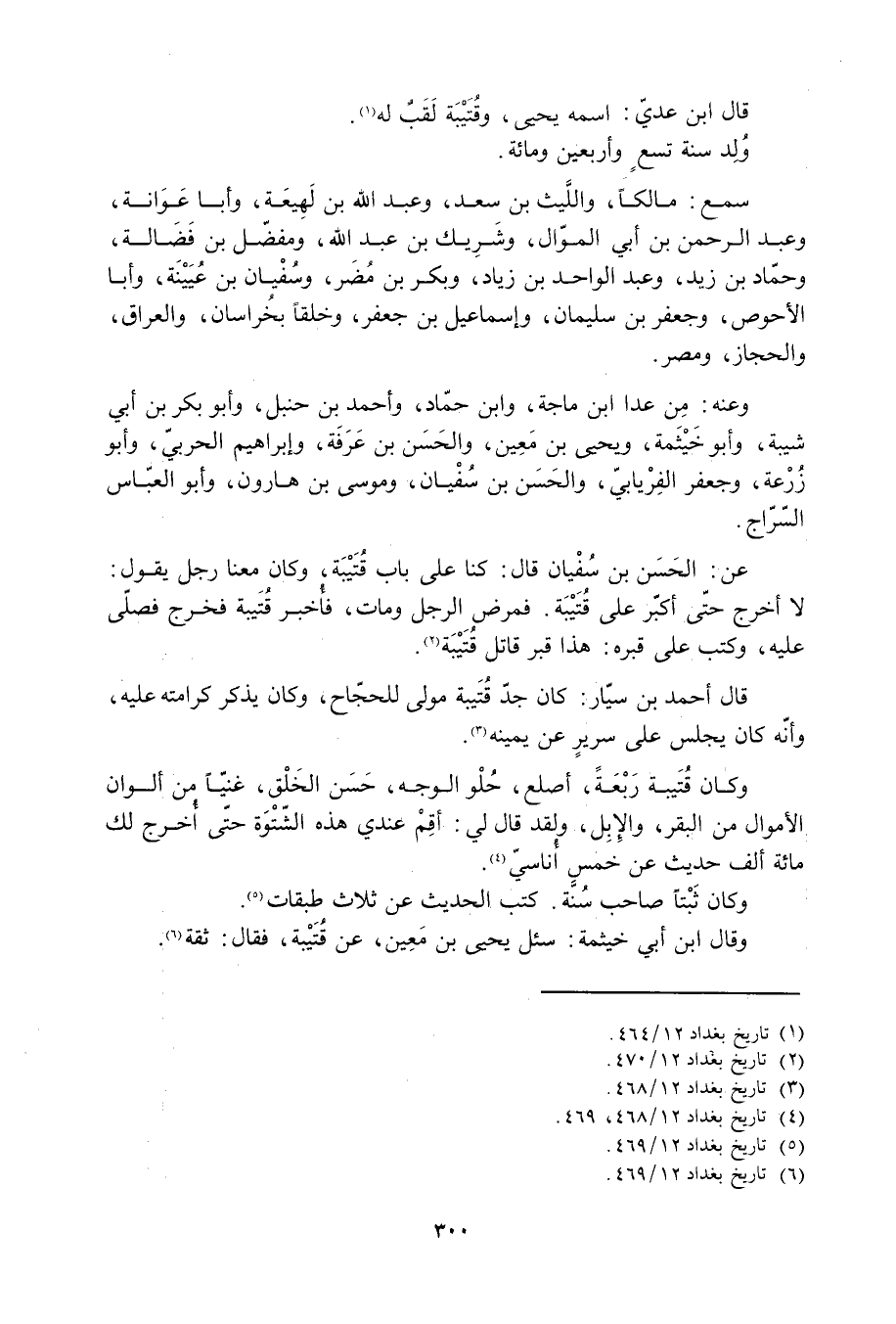 وقال ابن أَبِي خيثمة: سُئِلَ يَحْيَى بن معين، عن قتيبة، فقال: ثقة [6] .