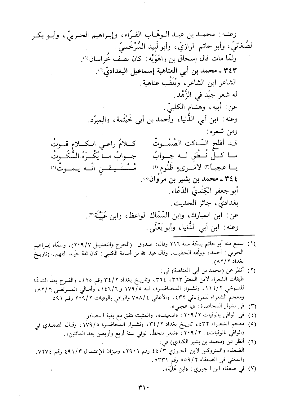 [5] معجم الشعراء 432، تاريخ بغداد 2/ 34، ونشوار المحاضرة 5/ 179، وقال الصفدي في «الوافي بالوفيات» . 2/ 209: «شعر منحطّ، توفي سنة أربع وأربعين بعد المائتين» .
