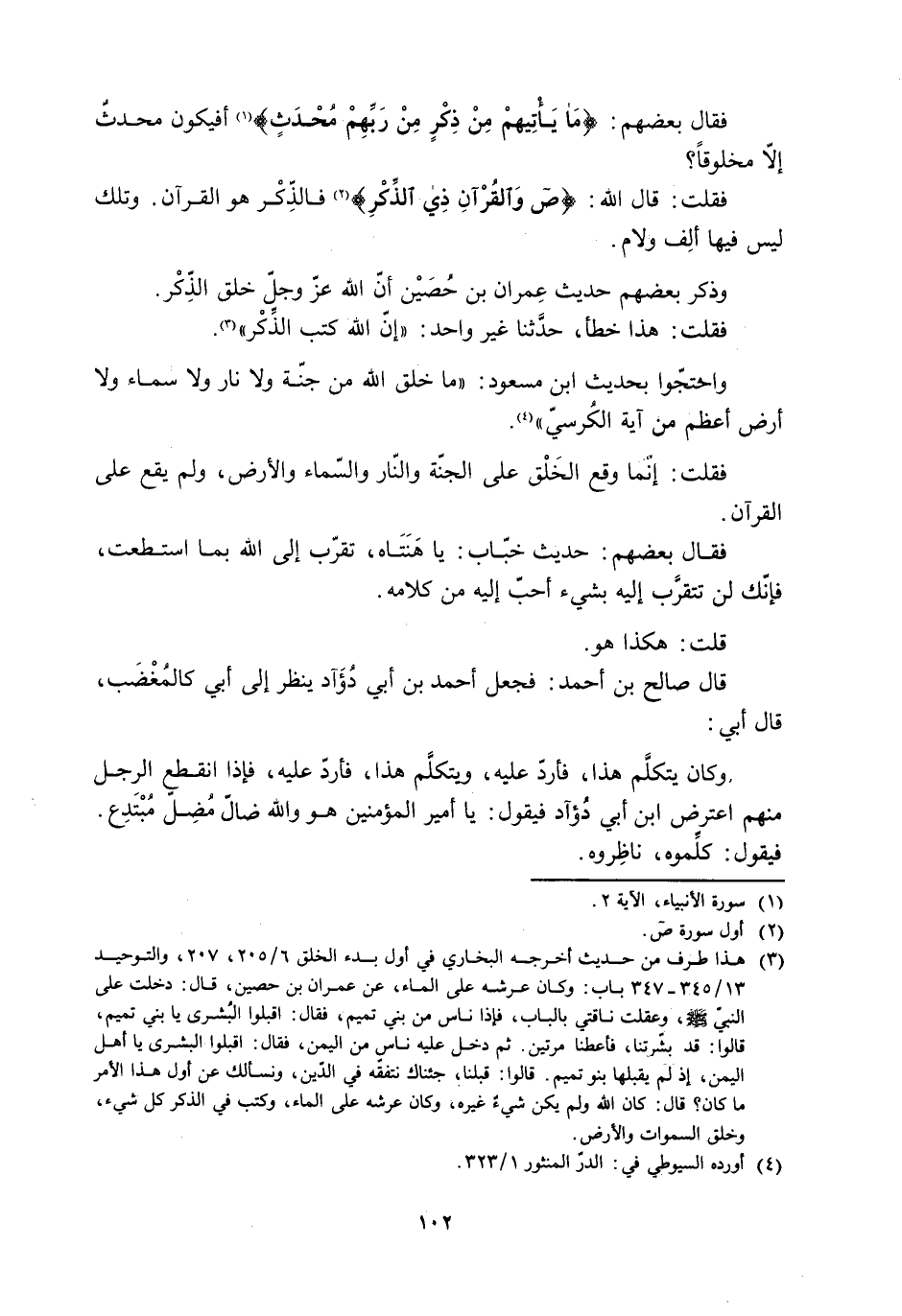 فَقَالَ بَعْضُهُمْ: مَا يَأْتِيهِمْ مِنْ ذِكْرٍ مِنْ رَبِّهِمْ مُحْدَثٍ 21: 2 [1] أَفَيَكُونُ مُحْدَثٌ إِلَّا مَخْلُوقًا؟