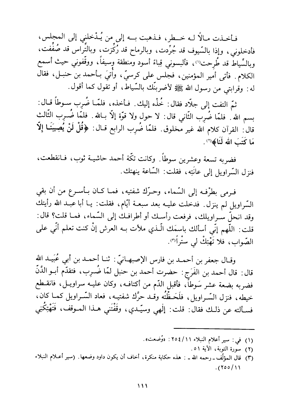 بسم الله. فلمّا ضُرِب الثّاني قَالَ: لا حَوْلَ وَلا قُوَّةَ إِلا باللَّه. فلمّا ضُرِب الثّالث قال: القرآن كلام الله غير مخلوق. فلما ضرب الرابع قال: قُلْ لَنْ يُصِيبَنا إِلَّا مَا كَتَبَ اللَّهُ لَنا 9: 51 [2] .