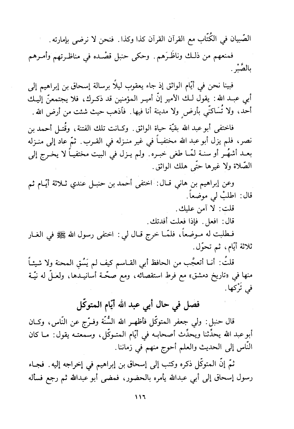 فصل في حال أبي عبد الله أيّام المتوكّل قال حنبل: ولي جعفر المتوكّل فأظهر الله السنة وفرّج عن النّاس، وكان أبو عبد الله يحدِّثنا ويحدِّث أصحابه في أيّام المتوكّل، وسمعته يقول: ما كان النّاس إلى الحديث والعلم أحوج منهم في زماننا.