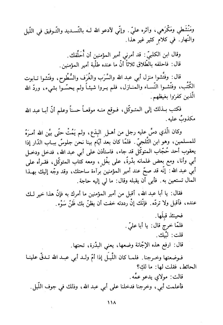 وكان الّذي دس عليه رجل من أهل البِدَع، ولم يَمُتْ حتّى بيَّن الله أمرَهُ للمسلمين، وهو ابن الثَّلجيّ. فلمّا كان بعد أيّام بينا نحن جلوسٌ بباب الدّار إذا يعقوب أحد حُجّاب المتوكّل قد جاء، فاستأذن على أبي عبد الله، فدخل ودخل أبي وأنا، ومع بعض غلمانه بدْرةٌ، على بغْلٍ، ومعه كتاب المتوكّل، فقرأه على أبي عبد الله: إنّه قد صحّ عند أمير المؤمنين برآءة ساحتك، وقد وجّه إليك بهذا المال تستعين به. فأبى أن يقبله وقال: ما لي إليه حاجة.