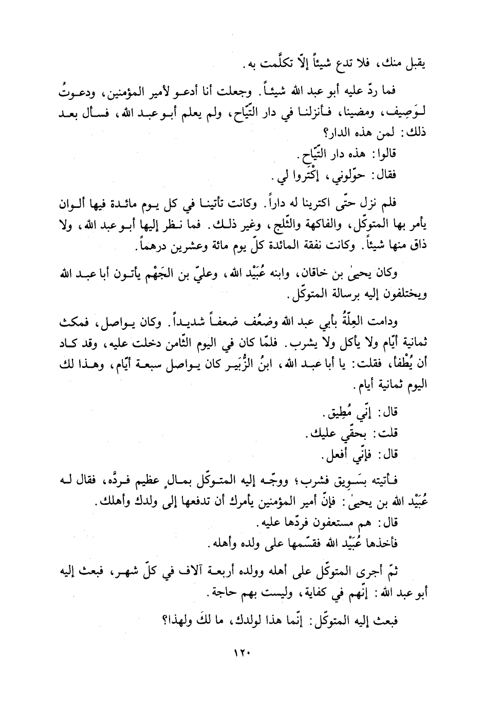 فلم نزل حتّى اكترينا له دارًا. وكانت تأتينا في كل يوم مائدة فيها ألوان يأمر بها المتوكّل، والفاكهة والثّلج، وغير ذلك. فما نظر إليها أبو عبد الله، ولا ذاق منها شيئًا. وكانت نفقة المائدة كلّ يوم مائة وعشرين درهمًا.