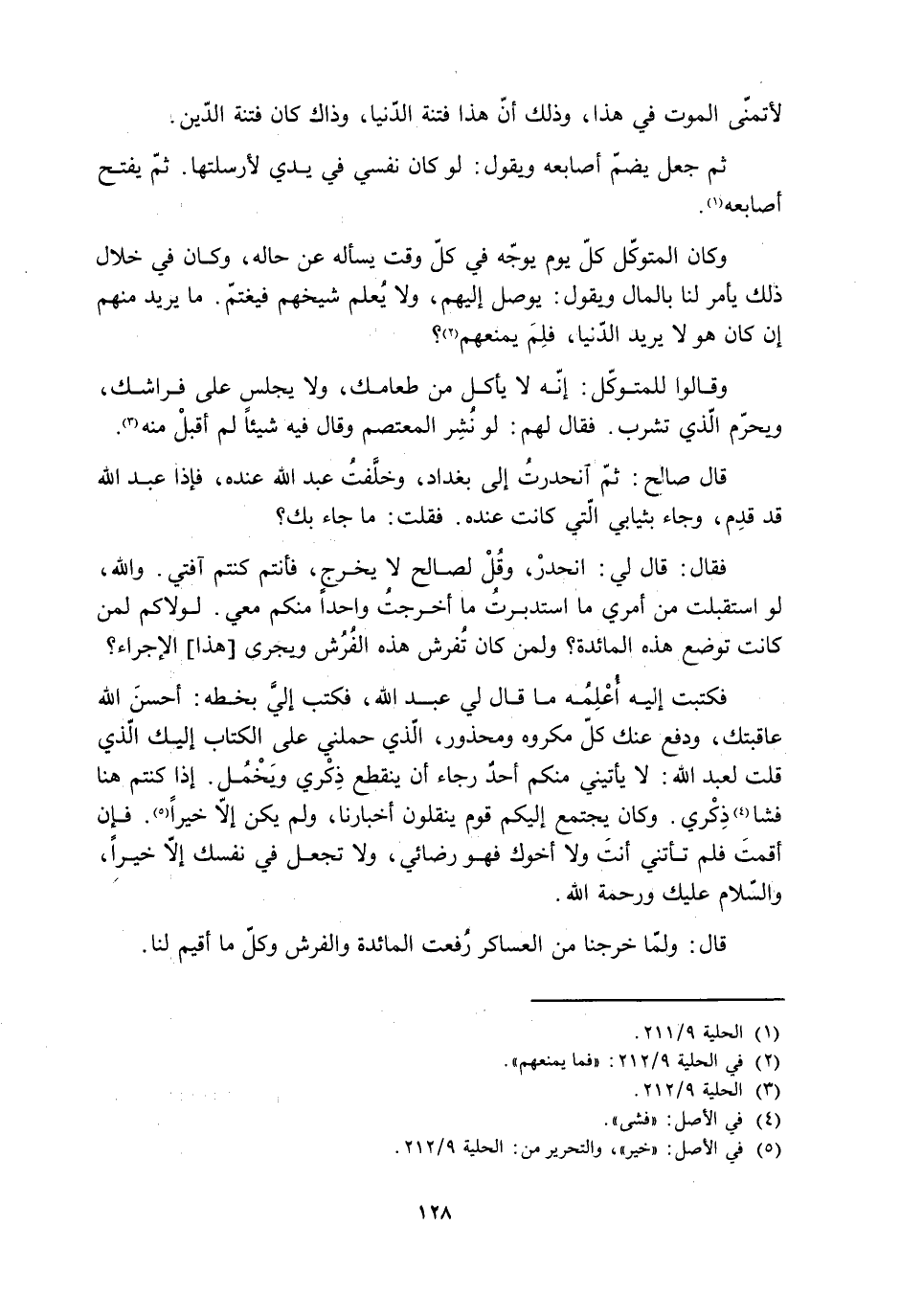 وكان المتوكّل كلّ يوم يوجّه فِي كلّ وقت يسأله عن حاله، وكان فِي خلال ذلك يأمر لنا بالمال ويقول: يوصل إليهم، ولا يُعلم شيخهم فيغتمّ. ما يريد منهم إن كان هُوَ لا يريد الدّنيا، فلِمَ يمنعهم [2] ؟