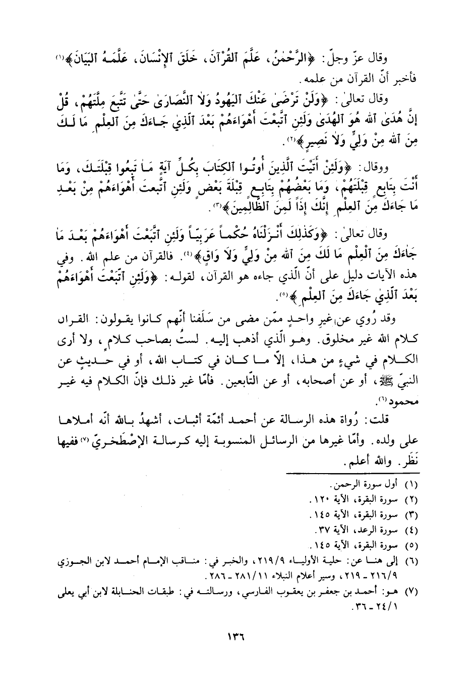 وقال تعالى: وَكَذلِكَ أَنْزَلْناهُ حُكْماً عَرَبِيًّا وَلَئِنِ اتَّبَعْتَ أَهْواءَهُمْ بَعْدَ مَا جاءَكَ مِنَ الْعِلْمِ مَا لَكَ مِنَ اللَّهِ مِنْ وَلِيٍّ وَلا واقٍ 13: 37 [4] . فالقرآن من علم اللَّه. وفي هذه الآيات دليل على أن الَّذِي جاءه هُوَ القرآن، لقوله: وَلَئِنِ اتَّبَعْتَ أَهْواءَهُمْ بَعْدَ الَّذِي جاءَكَ مِنَ الْعِلْمِ 2: 120 [5] .