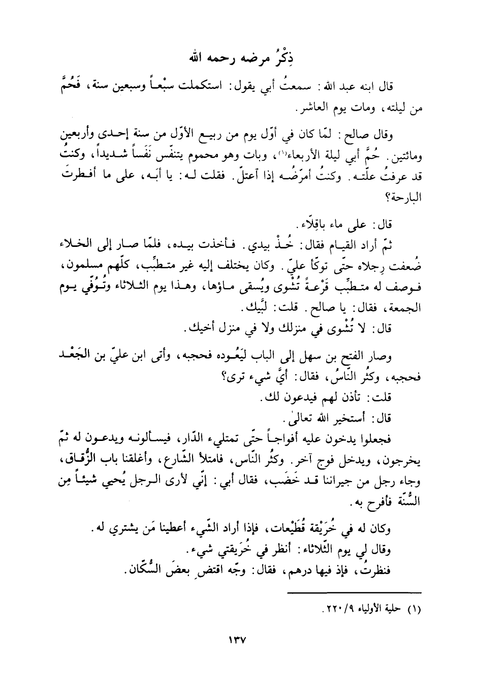 ثُمَّ أراد القيام فقال: خُذْ بيدي. فأخذت بيده، فلمّا صار إلى الخلاء ضعفت رِجلاه حَتَّى توكّأ علي. وكان يختلف إليه غير متطبب، كلهم مسلمون، فوصف له متطبّب قَرْعة تُشْوى ويُسقى ماؤها، وهذا يوم الثلاثاء وتُوُفّي يوم الجمعة، فقال: يا صالح. قلت: لَبَّيْك.
