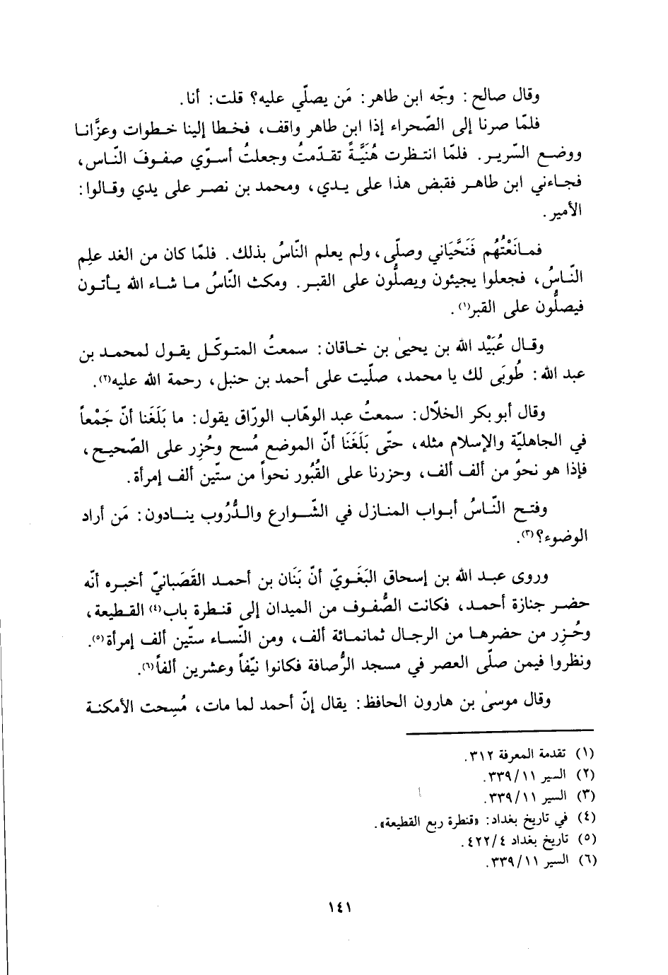 وروي عبد الله بْن إسحاق البَغَويّ أَنْ بنَان بْن أحمد القَصَبانيّ أخبره أنّه حضر جنازة أحمد، فكانت الصُّفوف من الميدان إلى قنطرة باب [4] القطيعة، وحُزِر من حضرها من الرجال ثمانمائة ألف، ومن النّساء ستّين ألف امْرَأَة [5] .