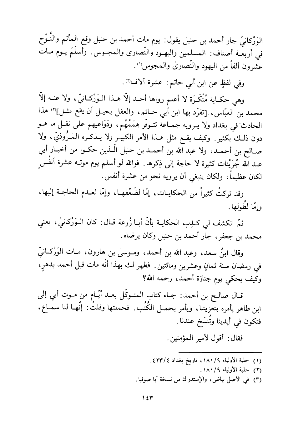وهي حكاية مُنْكَرَة لا أعلم رواها أحد إلا هذا الوَرْكانيّ، ولا عَنْهُ إلا محمد بْن الْعَبَّاس، [تفرّد بها ابن أبي حاتم، والعقل يحيل أن يقع مثل] [3] هذا الحادث فِي بغداد ولا يرويه جماعة تتوفّر هِمَمُهُم، ودَوَاعيهم على نقل ما هُوَ دون ذلك بكثير. وكيف يقع مثل هذا الأمر الكبير ولا يذكره المَرُّوذيّ، ولا صالح بْن أحمد، ولا عبد الله بْن أحمد بْن حنبل الّذين حكوا من أخبار أبي عبد الله جزئيات كثيرة لا حاجة إلى ذكرها. فو الله لو أسلم يوم موته عشرة أَنَفسٍ لكان عظيمًا، ولكان ينبغي أن يرويه نحو من عشرة أنفس.