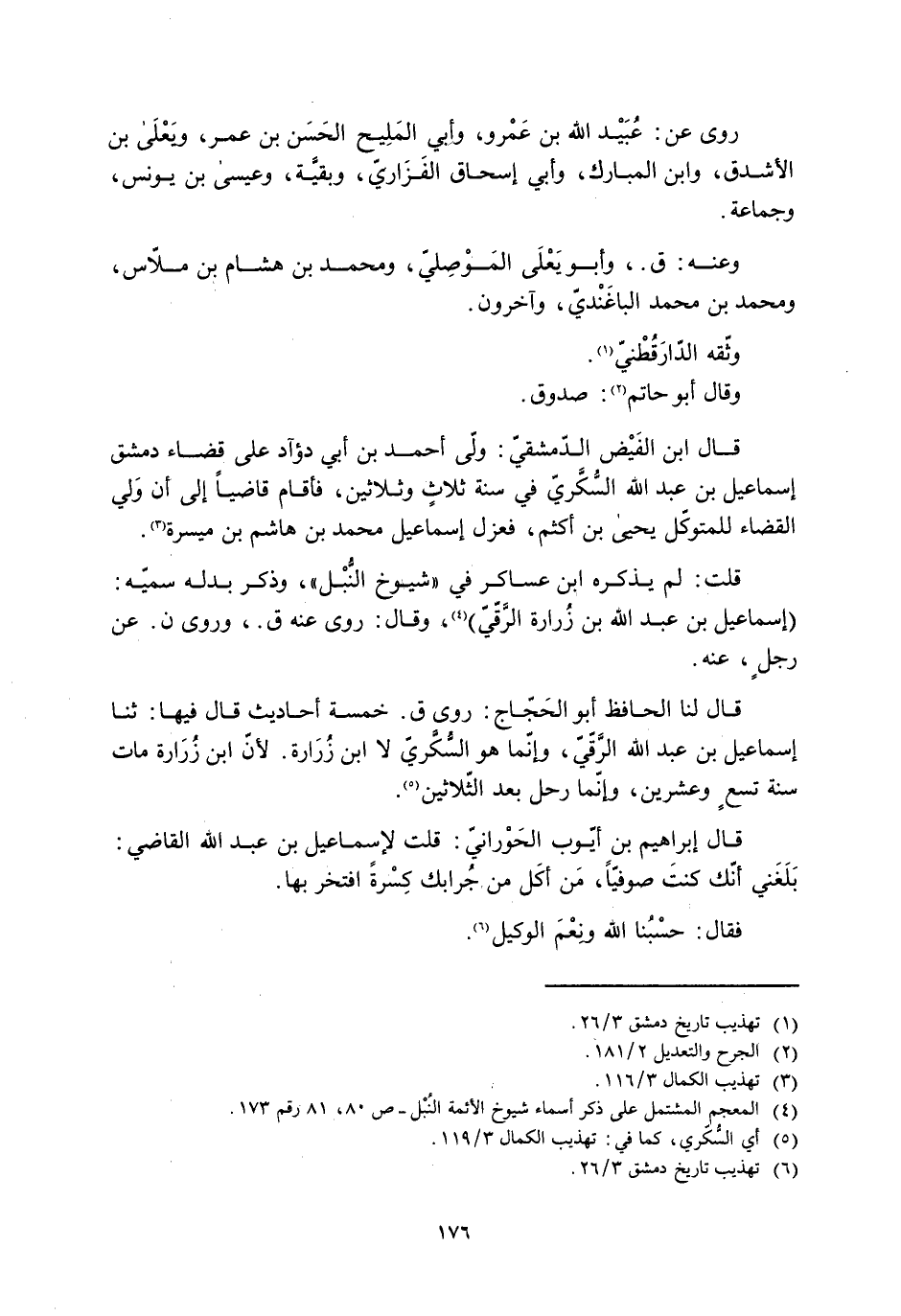 قال لنا الحافظ أبو الحجاج: رُوِيَ ق. خمسة أحاديث قال فيها: ثنا إسماعيل بْن عبد الله الرقي، وإنما هُوَ السكري لا ابن زرارة. لأن ابن زرارة مات سنة تسع وعشرين، وإنما رحل بعد الثلاثين [5] .