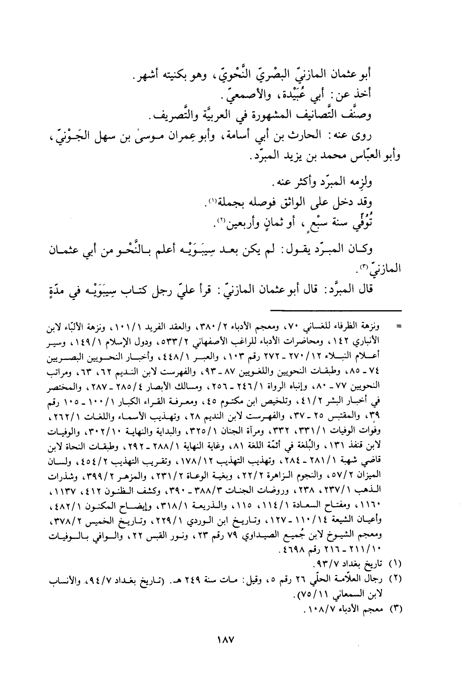وكان المبرد يقول: لم يكن بعد سيبويه أعلم بالنحو من أبي عثمان الْمَازِنِيِّ [3] .