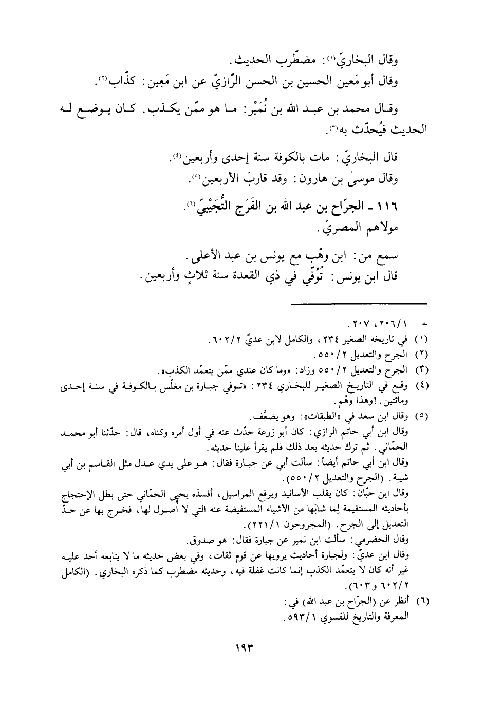 [4] وقع في التاريخ الصغير للبخاريّ 234: «توفي جبارة بن مغلّس بالكوفة في سنة إحدى ومائتين.! وهذا وهم.