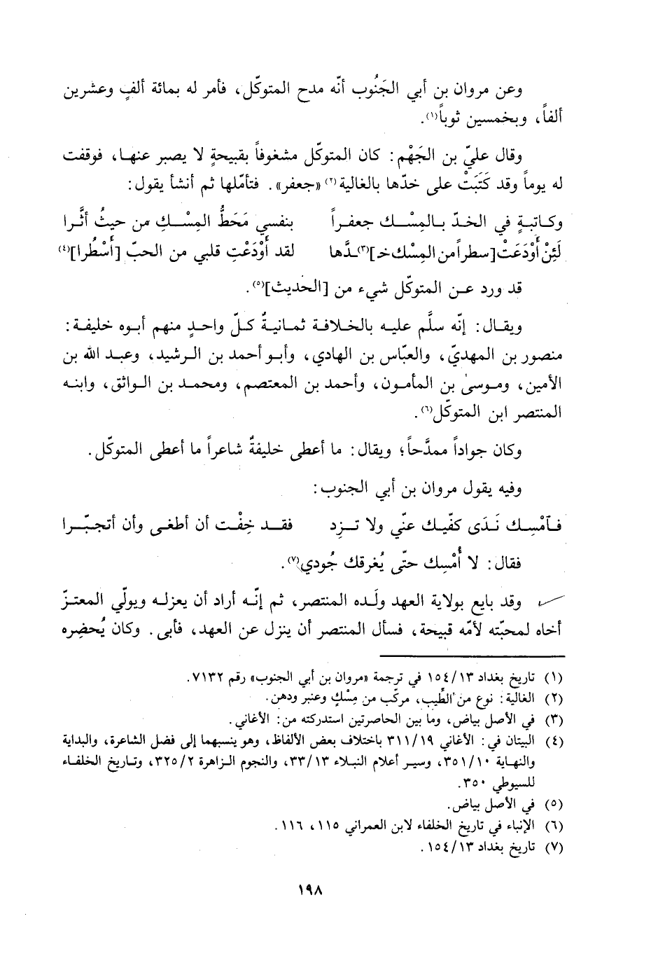 [4] البيتان في: الأغاني 19/ 311 باختلاف بعض الألفاظ، وهو ينسبهما إلى فضل الشاعرة، والبداية والنهاية 10/ 351، وسير أعلام النبلاء 13/ 33، والنجوم الزاهرة 2/ 325، وتاريخ الخلفاء للسيوطي 350.