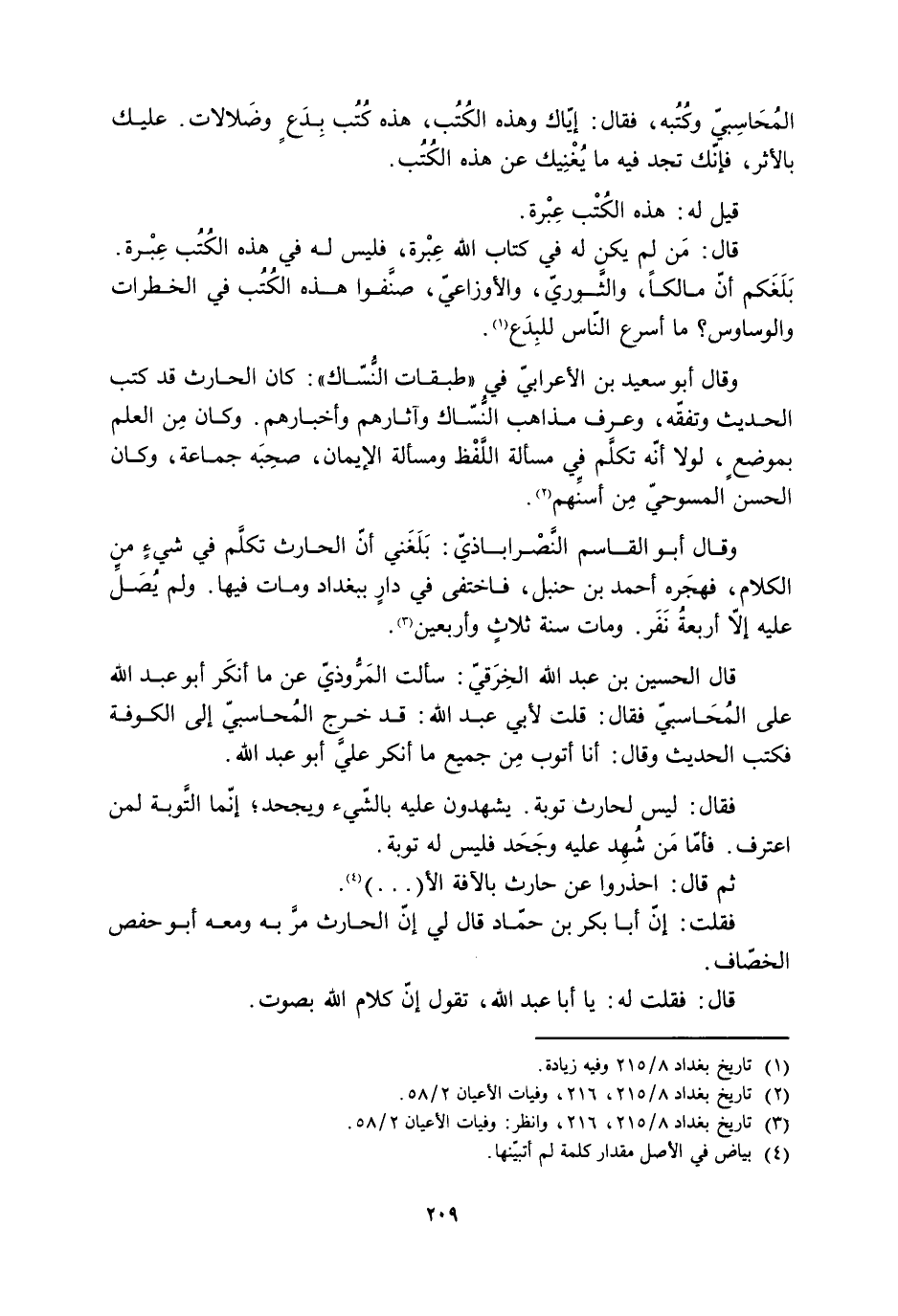 المُحَاسبيّ وكُتُبه، فقالَّ: إيّاك وهذه الكُتُب، هذه كُتُب بِدَعٍ وضَلالات. عليك بالأثر، فإنّك تجد فِيهِ ما يُغْنيك عن هذه الكُتُب.