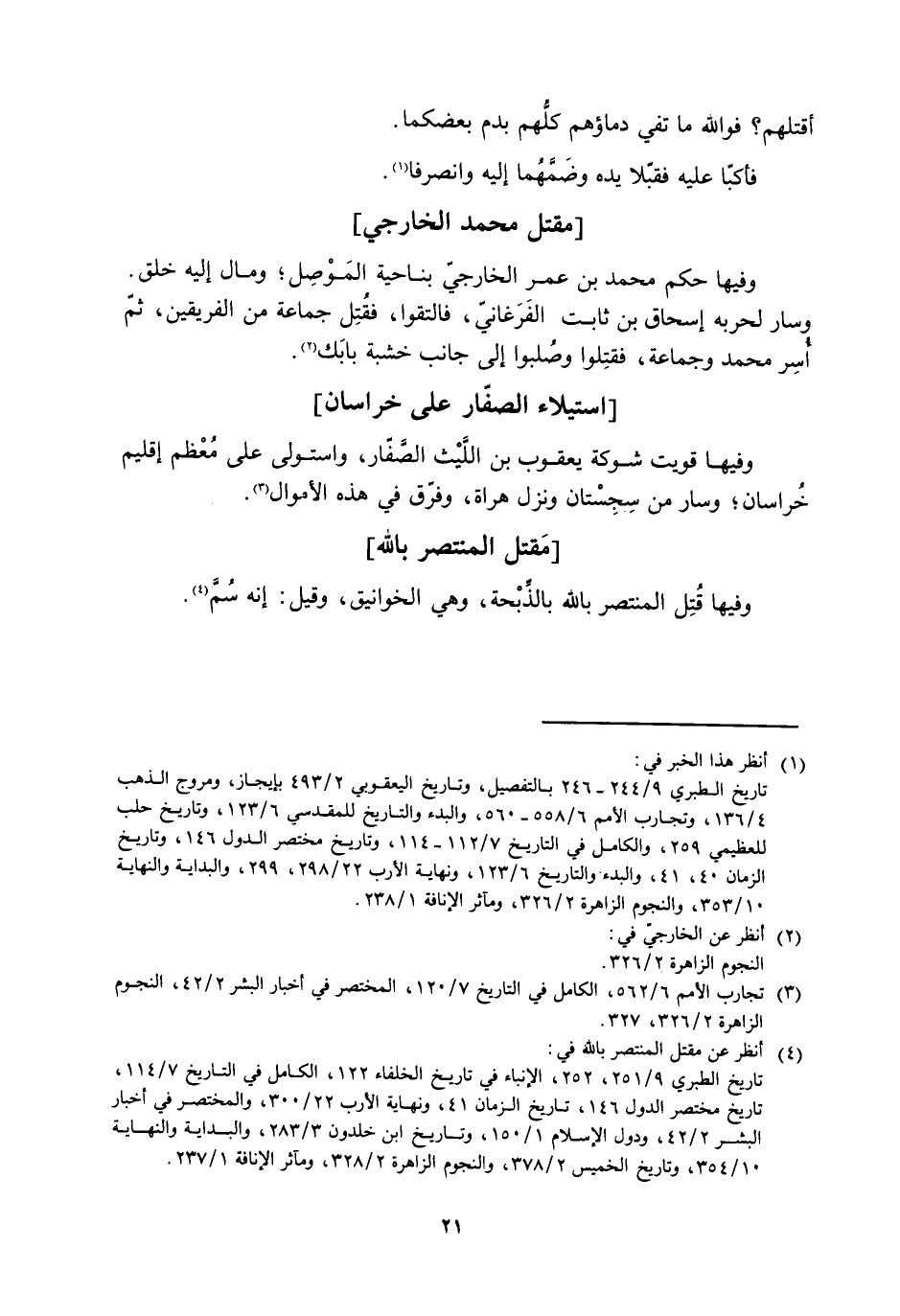 [3] تجارب الأمم 6/ 562، الكامل في التاريخ 7/ 120، المختصر في أخبار البشر 2/ 42، النجوم الزاهرة 2/ 326، 327.