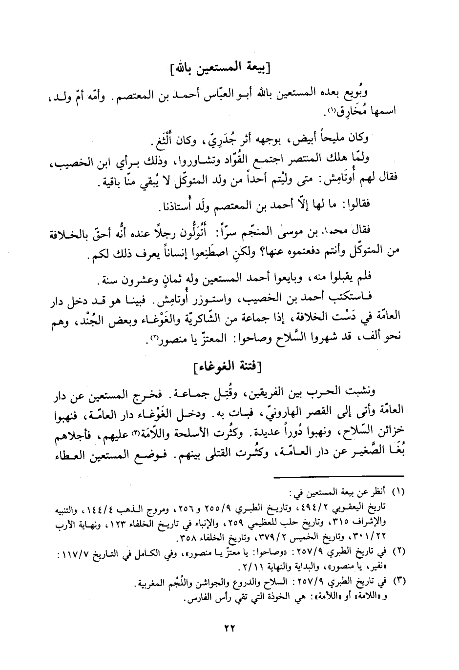 [2] في تاريخ الطبري 9/ 257: «وصاحوا: يا معتزّ يا منصور» ، وفي الكامل في التاريخ 7/ 117: