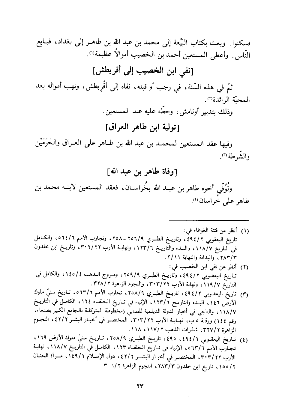 [4] تاريخ اليعقوبي 2/ 494، 495، تاريخ الطبري 9/ 258، تاريخ سنّي ملوك الأرض 169، تجارب الأمم 6/ 563، الإنباء في تاريخ الخلفاء 123، الكامل في التاريخ 7/ 118، نهاية الأرب 22/ 303، المختصر في أخبار البشر 2/ 42، دول الإسلام 2/ 149، مرآة الجنان 2/ 155، تاريخ ابن خلدون 3/ 283، النجوم الزاهرة 2/ 328.